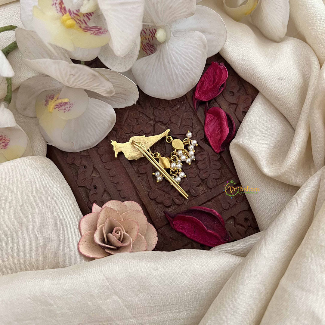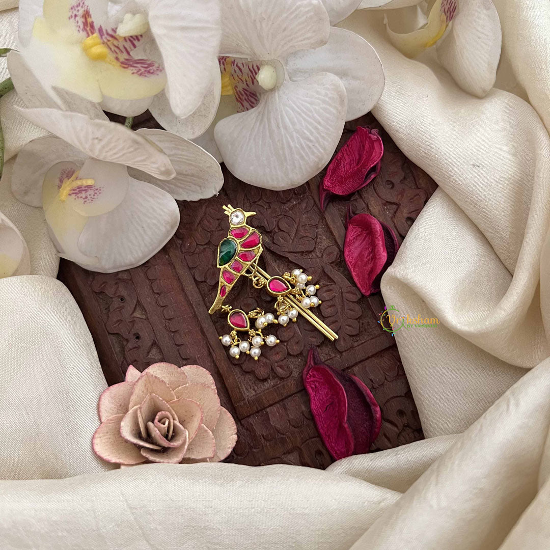 The Vriksham Peacock Grace Kundan Jadau Jada Billai showcases an elegant peacock motif adorned with red, green, and white stones, enhanced by delicate pearls. This sophisticated accessory brings a regal charm to traditional hairstyles, perfect for weddings and special celebrations. Its intricate design and fine craftsmanship offer timeless beauty and grace.