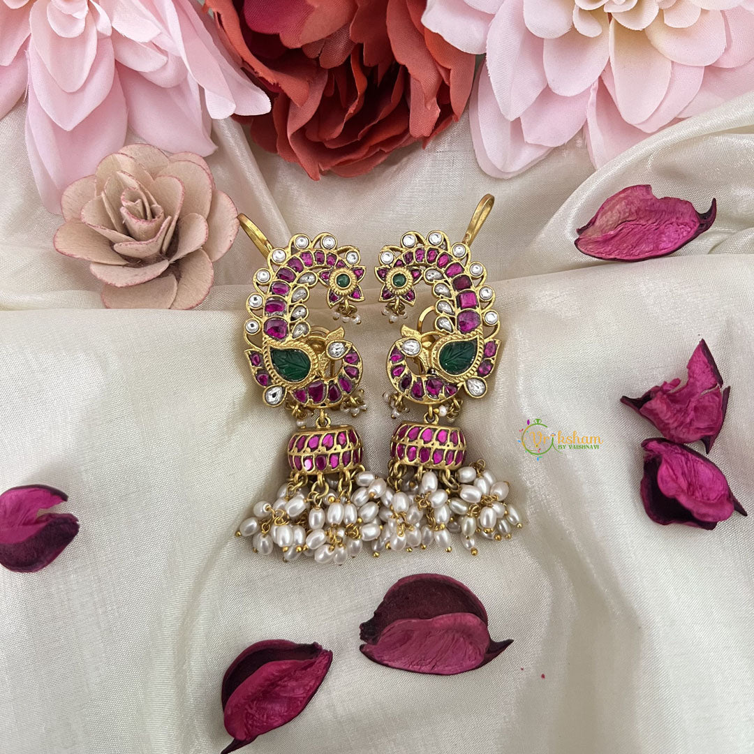 Experience the sublime elegance of Vriksham's Peacock Kundan Jadau Cuff Jhumkas. These distinguished ornaments showcase the revered peacock motif—a symbol of grace and nobility—meticulously crafted using traditional Kundan Jadau techniques. The refined palette of rich red, verdant green, and pristine white creates a harmonious composition, thoughtfully enhanced with delicate rice pearls that add subtle luminosity. The innovative cuff jhumka design offers both the classic cascade effect and secure comfort.