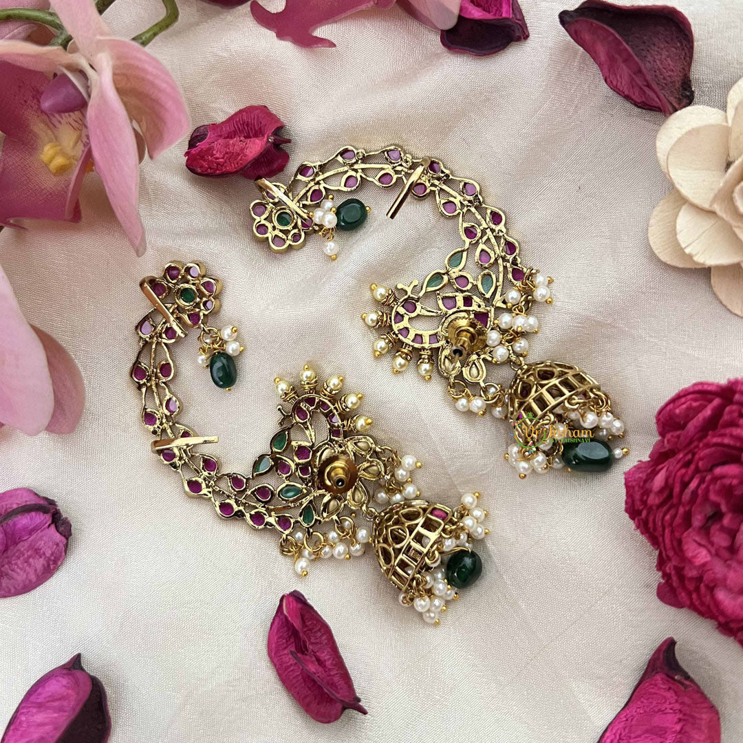 Adorn yourself with this exquisite bridal ear cuff, a stunning fusion of peacock grandeur and botanical elegance. Embellished with lustrous pearls and rendered in a harmonious palette of red, green, and white, this piece epitomizes bridal sophistication. The intricate leaf and floral motifs showcase meticulous craftsmanship, creating a luminous accessory that commands attention without overwhelming. Perfect for weddings and ceremonial occasions, this ear cuff seamlessly blends heritage artistry with contemporary styling, offering a distinctive touch of refined beauty to your bridal ensemble.