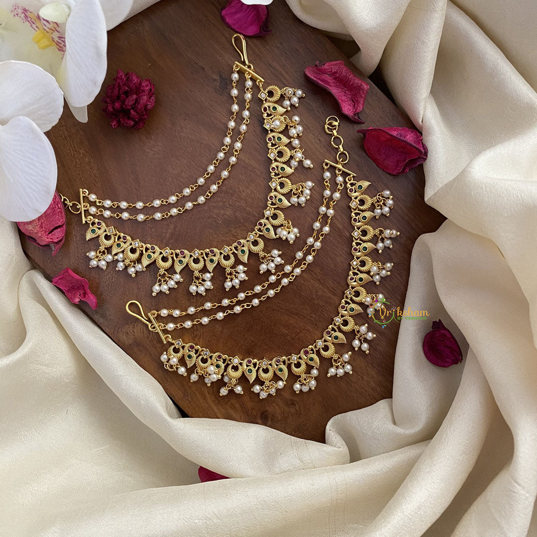 Add an elegant touch to your look with Vriksham's Peacock Maatil/Earchain-Guttapusalu. Featuring intricate peacock designs, this stunning piece will elevate any outfit. Made with the highest quality materials, it exudes luxury and exclusivity. Make a statement with this premium accessory.