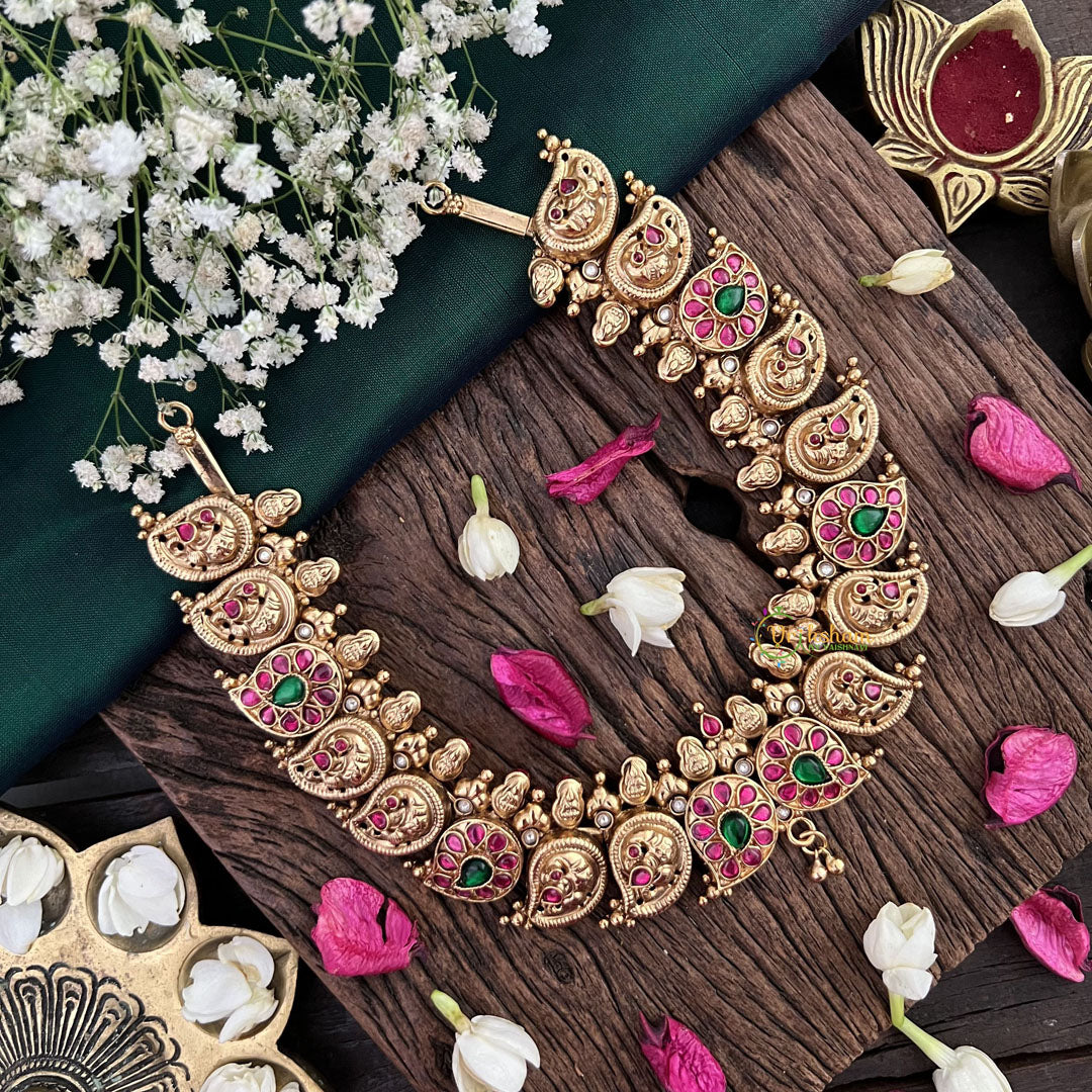 The Vriksham Peacock Motif Antique 1 gm Gold Finish Temple Necklace showcases intricate peacock designs inspired by traditional temple art. This lightweight piece combines antique charm with refined elegance, making it a sophisticated accessory for festive and cultural occasions.