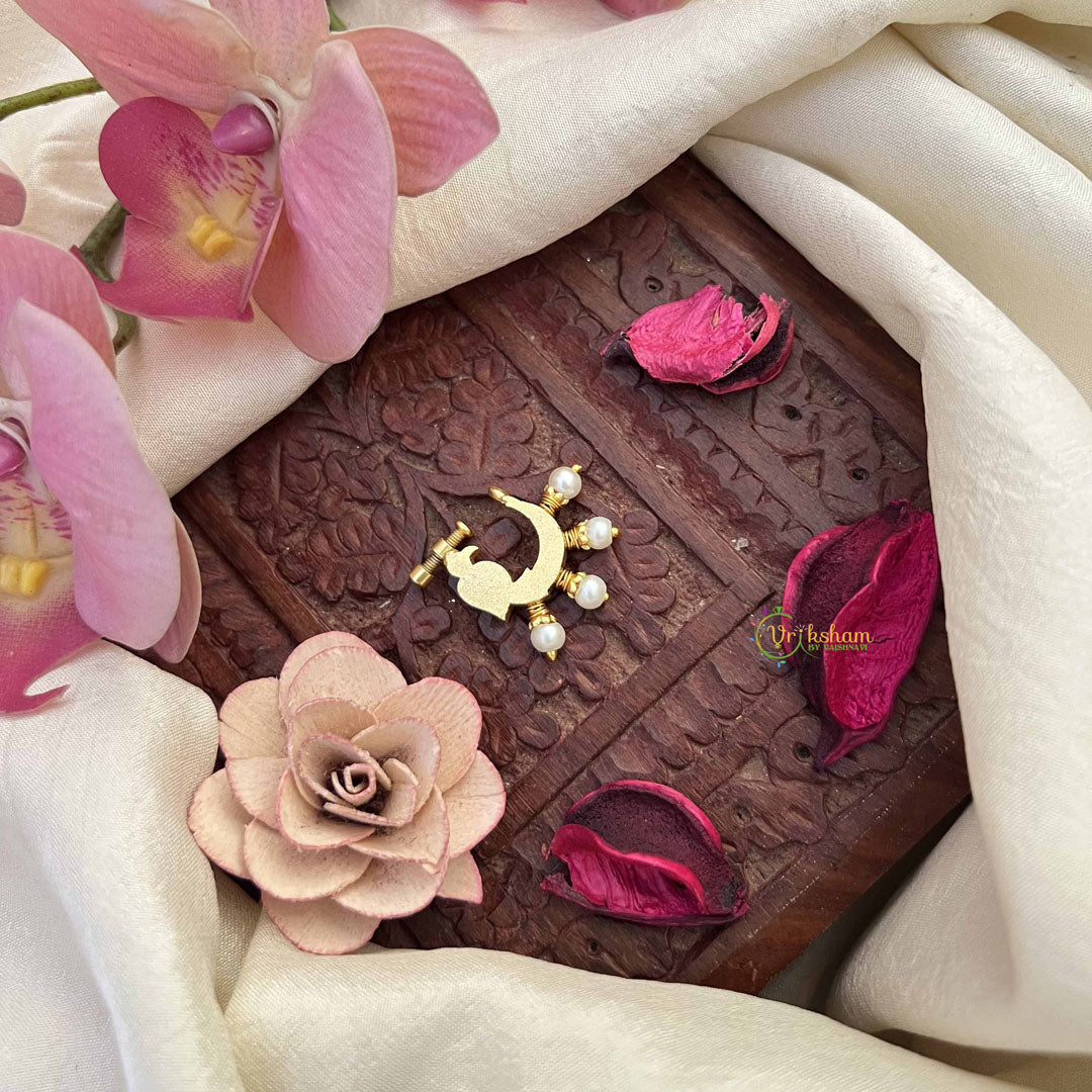 The Vriksham Peacock Motif Style Nath beautifully combines red, white, and green stones with delicate pearls, all crafted in intricate Jadau work. This press-fit nose pin offers a sophisticated blend of vibrant colors and timeless elegance, enhancing your traditional ensemble with graceful charm.