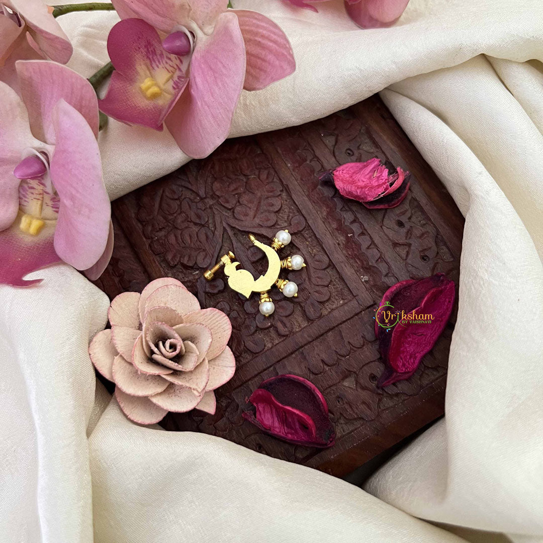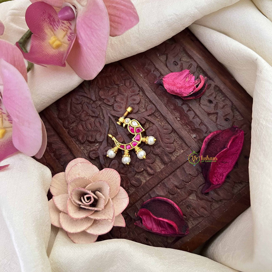 The Vriksham Peacock Motif Style Nath features a harmonious blend of red and white stones paired with lustrous pearls, all set in intricate Jadau craftsmanship. This press-fit nose pin offers a refined balance of traditional artistry and elegant comfort, perfect for elevating your festive and ceremonial attire.