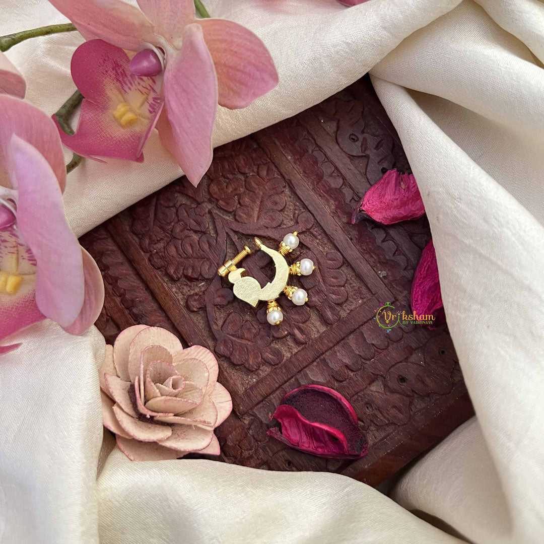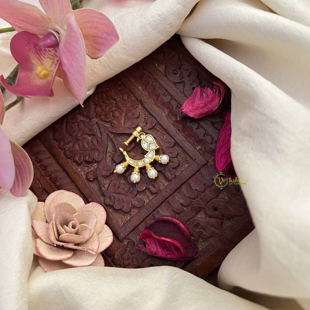 The Vriksham Peacock Motif Style Nath showcases delicate white stones set in exquisite Jadau artistry, capturing the grace of the peacock design. This press-fit nose pin combines traditional elegance with secure comfort, making it a distinguished accessory for refined occasions.