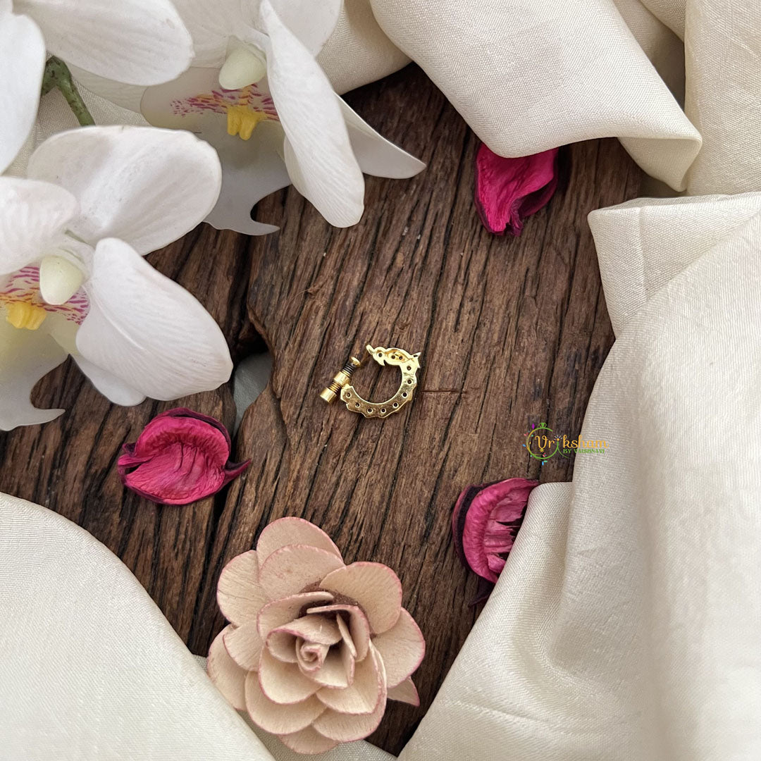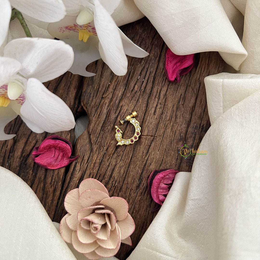The Vriksham Peacock Naths showcases a stunning blend of red, white hues inspired by the graceful beauty of the peacock. This intricately designed nose pin combines vibrant colors with elegant craftsmanship, offering a sophisticated accessory that adds a regal and refined touch to any ensemble.