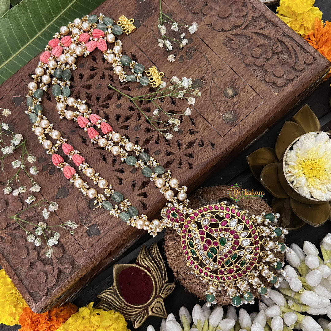 The Vriksham Peacock with Lakshmi Style Pendant 2-Layer Green Beaded Mala features a refined combination of red and white accents complemented by white and aqua beads. This sophisticated necklace blends intricate peacock and Lakshmi motifs with elegant layering, offering a graceful accessory that enhances traditional ensembles with subtle charm and cultural significance.