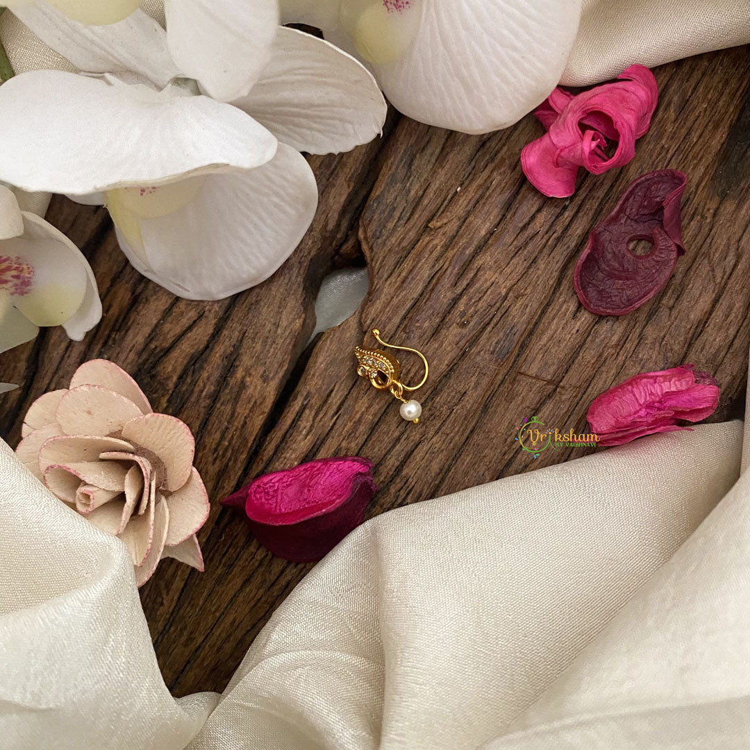 Elevate your style with the Vriksham Peacock Shape AD Stone Nath/Nose pin, adorned with a beautiful pearl in a stunning white hue. This luxurious piece gracefully enhances your look with sophistication and elegance, making you feel like a peacock in all its grandeur. Elevate your beauty with this exclusive accessory.