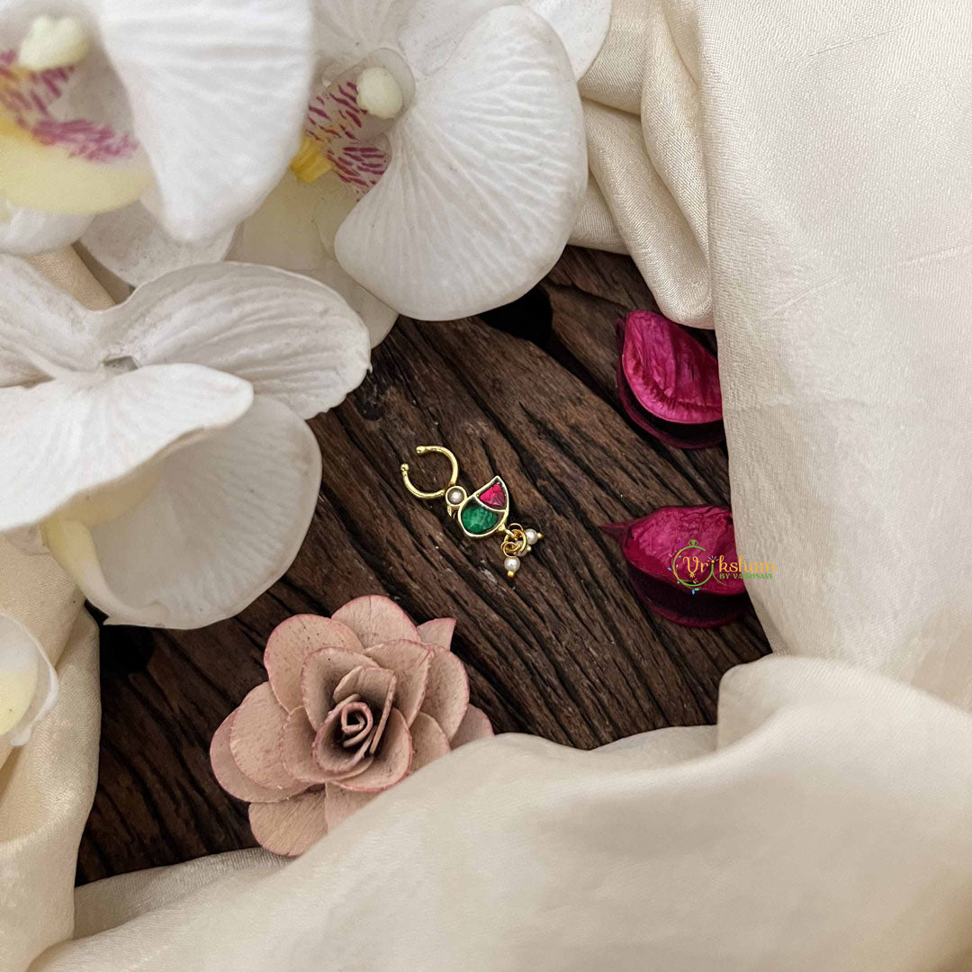 The Vriksham Peacock Style Golden Kundan Jadau Septum Ring in red and green features intricate craftsmanship inspired by the elegance of the peacock. Its rich golden finish paired with vibrant Kundan stones creates a sophisticated accessory that adds a regal and distinctive flair to your look.