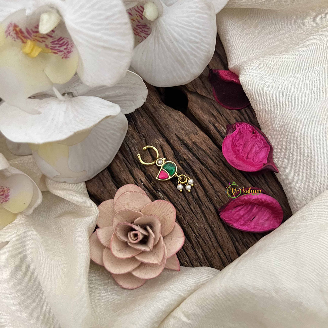 The Vriksham Peacock Style Golden Kundan Jadau Septum Ring in red and green showcases intricate craftsmanship inspired by the graceful peacock motif. Featuring a rich golden finish accented with vibrant Kundan stones, this refined accessory adds a regal and elegant touch to your ensemble.