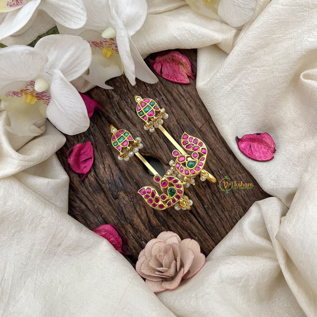 The Vriksham Peacock Style Jadau Ear Cuffs with Pearls feature exquisite peacock-inspired jadau craftsmanship, combining intricate artistry with the gentle shimmer of pearls. These ear cuffs add a sophisticated, traditional charm to your ensemble, making them perfect for special occasions or elegant everyday wear without requiring piercings.