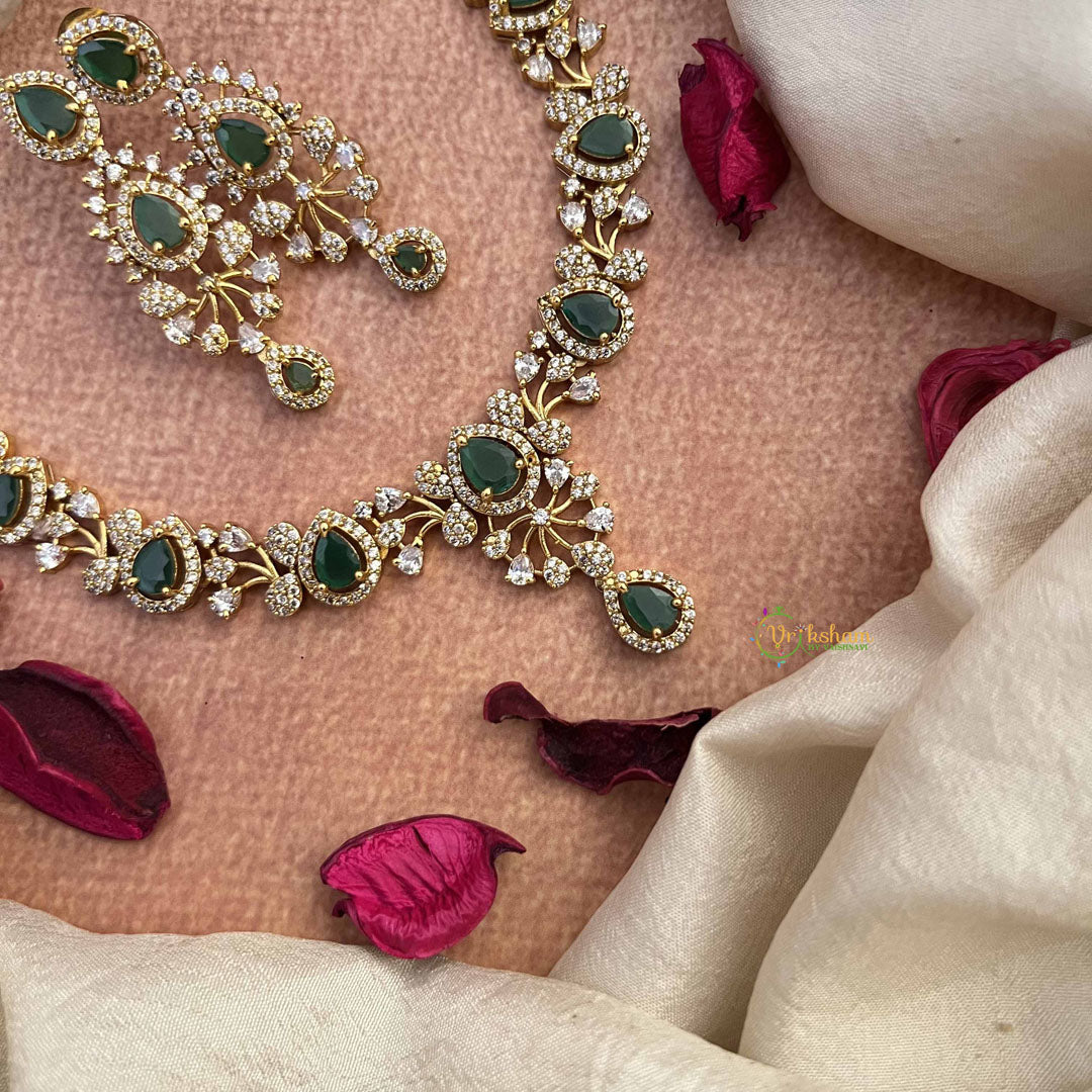 Celebrate natural elegance with this Pear Drop Style AD Stone Short Neckpiece in lush green. This refined piece showcases gracefully suspended pear-shaped elements adorned with brilliant AD stones that dance with ethereal light. The verdant green tone evokes timeless sophistication while adding a distinctive touch to your jewelry collection. The balanced short length makes it effortlessly versatile, complementing both traditional and contemporary styling. Perfect for those seeking a jewel that harmonizes grace with understated glamour, this neckpiece embodies serene beauty and enduring refinement.