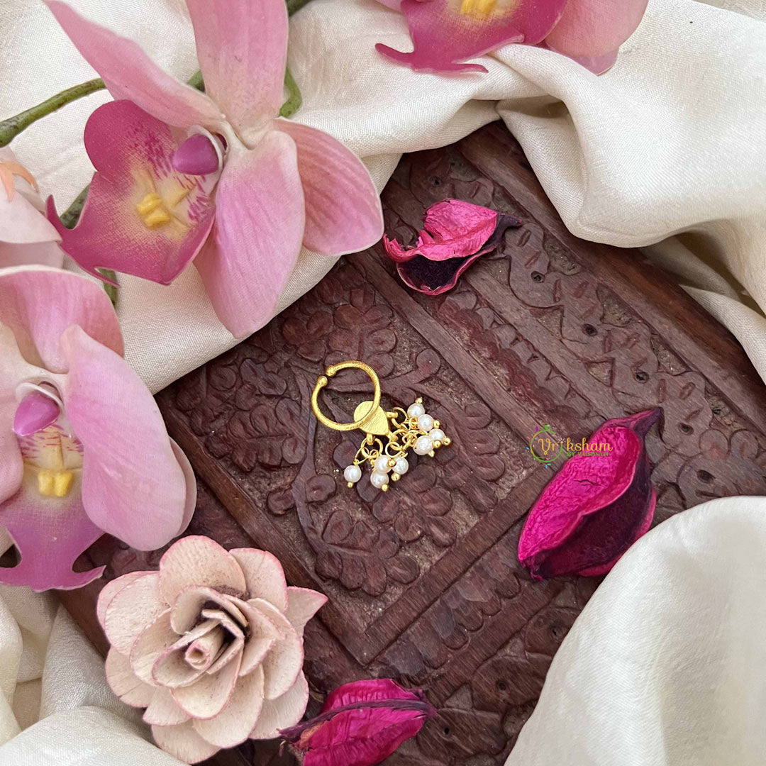 This pear drop style septum ring combines lustrous white pearls with intricate gold-toned Kundan Jadau craftsmanship. Its elegant design offers a delicate balance of classic beauty and refined artistry, perfect for adding a subtle yet sophisticated statement to your traditional look.