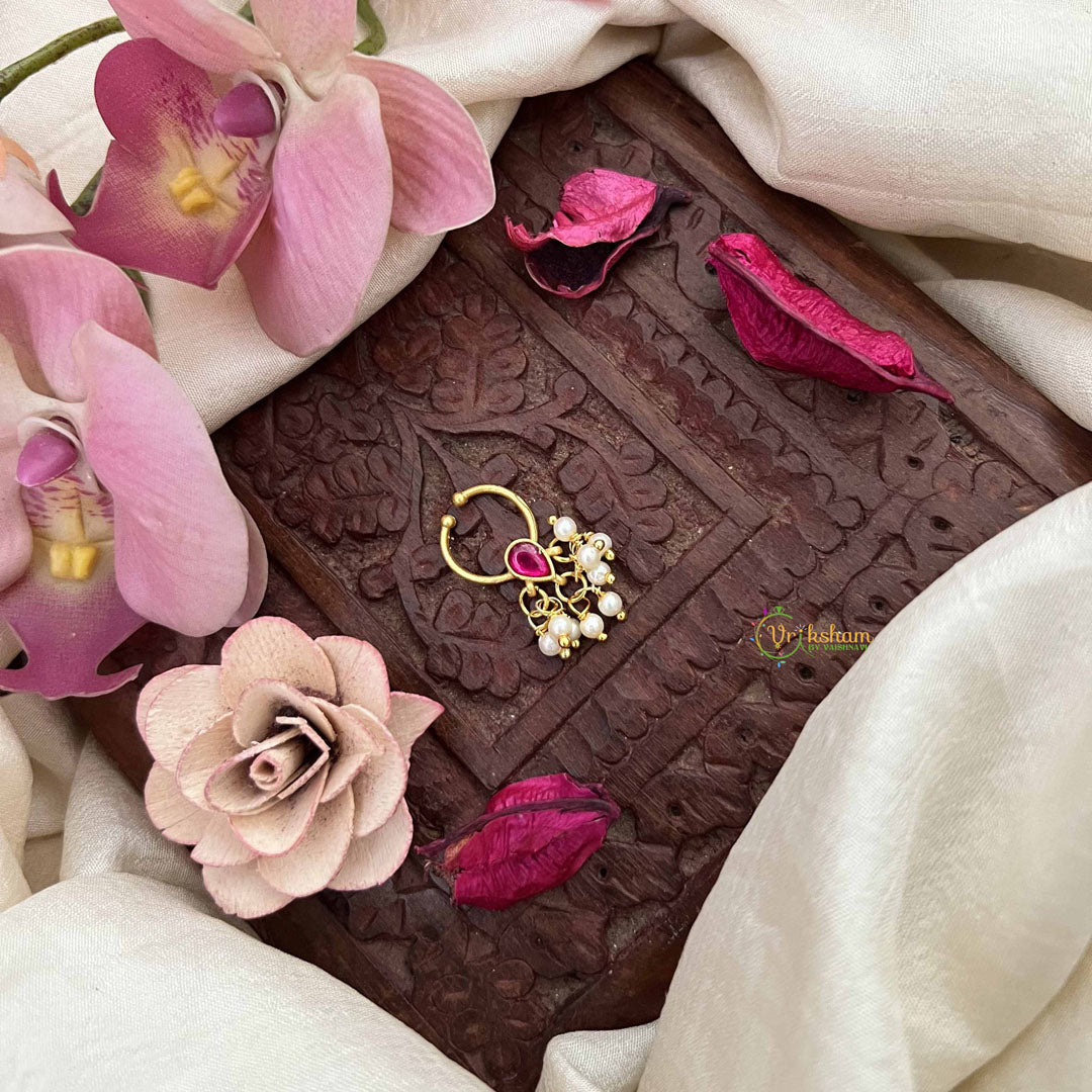 This pear drop style septum ring features a rich red centerpiece set in a gold-toned Kundan Jadau design. Its elegant shape and intricate detailing enhance its refined appeal, making it an ideal accessory to bring subtle luxury and traditional sophistication to your ensemble.