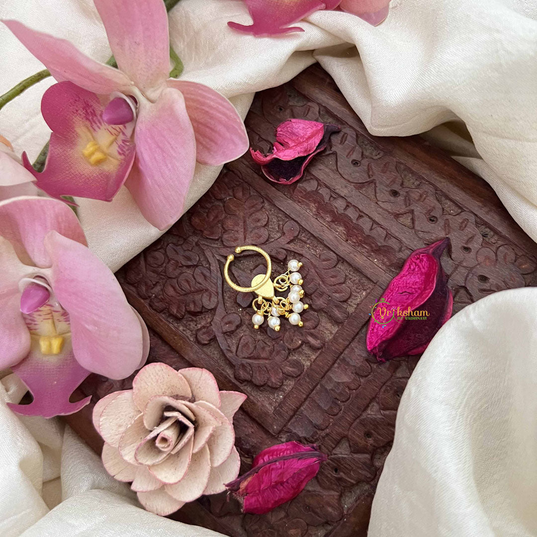This pear drop style septum ring combines lustrous white pearls with intricate gold-toned Kundan Jadau craftsmanship. Its elegant design offers a delicate balance of classic beauty and refined artistry, perfect for adding a subtle yet sophisticated statement to your traditional look.