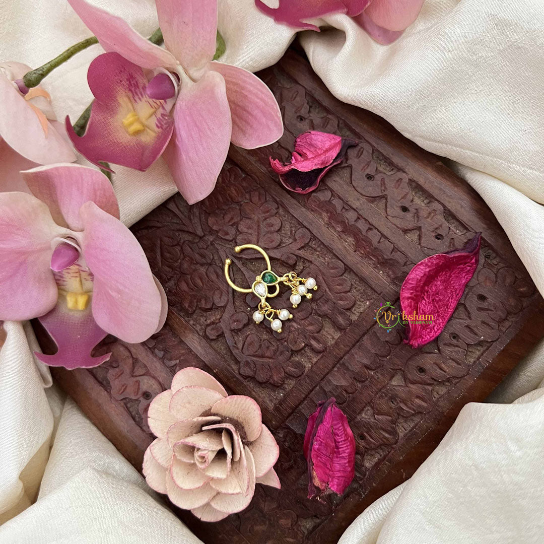 Embrace elegance with the Vriksham Pear Shape Gold-Toned Septum Ring, beautifully accented with white and green details. This sophisticated piece pairs the timeless warmth of gold with fresh, subtle hues, creating a refined accessory that enhances your look with understated charm. Perfect for those who appreciate a balanced blend of classic and contemporary style.
