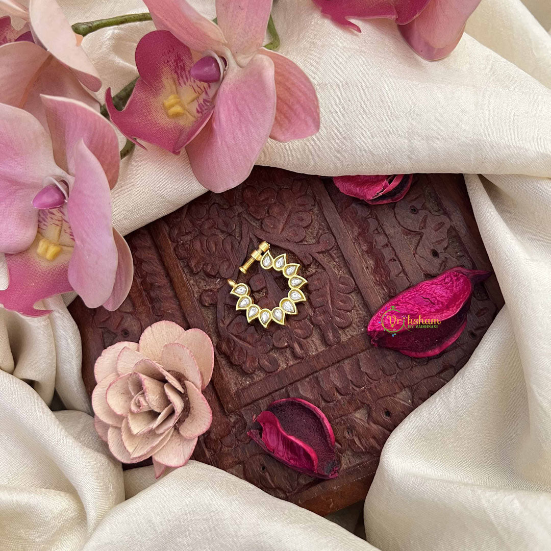 The Vriksham Pear Shape Nath features elegant white stones set in intricate Jadau craftsmanship. Its timeless pear-shaped design with a secure press-fit offers a refined and comfortable accessory, perfect for adding subtle sophistication to your traditional look.