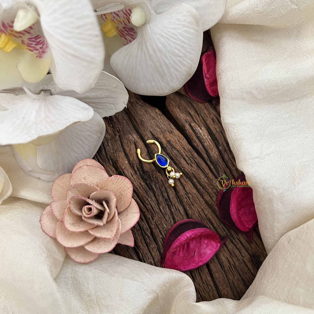 The Vriksham Pear Style Golden Kundan Jadau Septum Ring features a gold-toned finish beautifully accented with deep blue stones and delicate pearls. Its elegant pear-shaped design combines traditional craftsmanship with sophisticated detail, offering a refined accessory that adds a timeless and graceful touch to any ensemble.