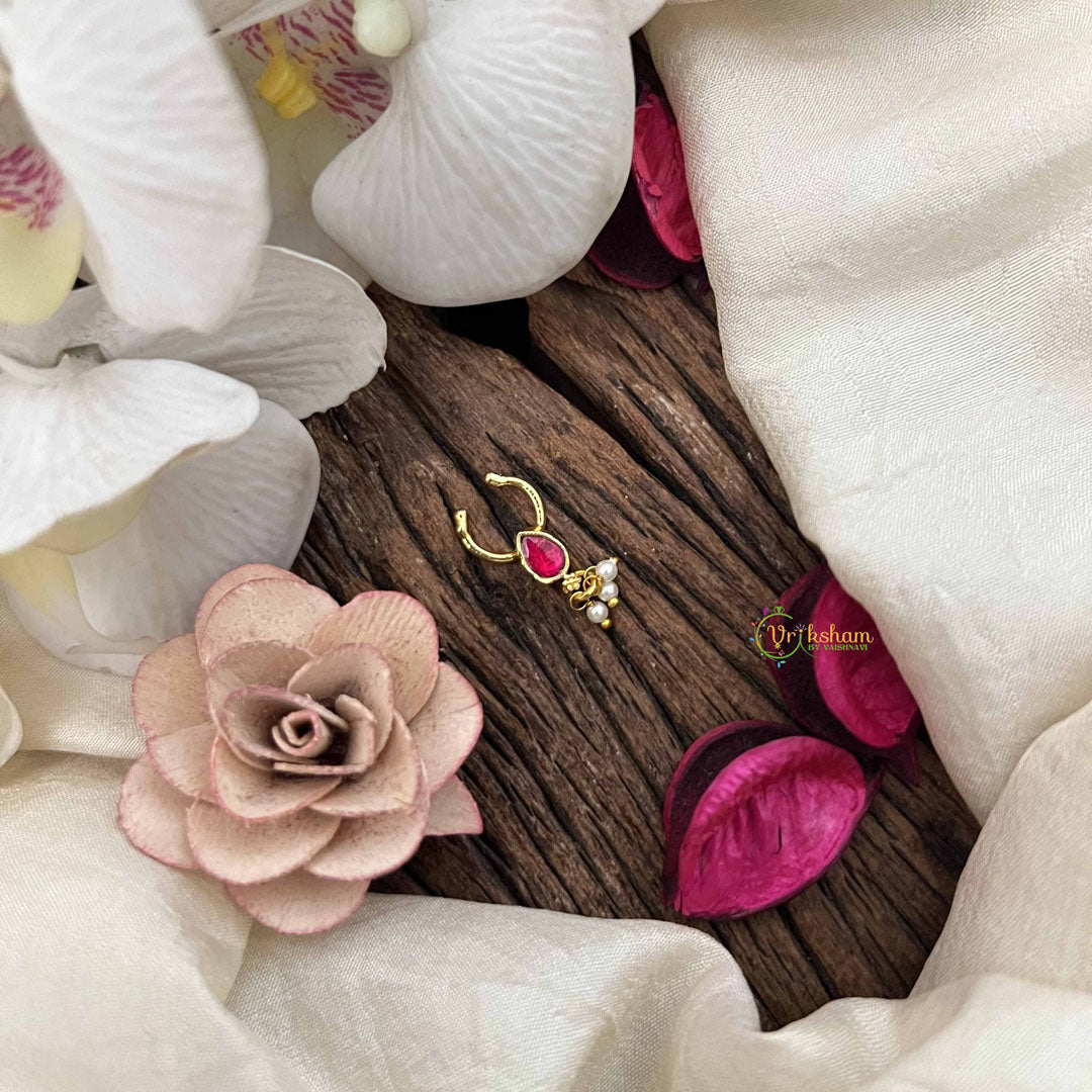 The Vriksham Pear Style Golden Kundan Jadau Septum Ring features a gold-toned finish adorned with rich red stones and delicate pearls. Its elegant pear-shaped design blends traditional artistry with refined sophistication, making it a graceful accessory that enhances any ensemble with timeless charm.