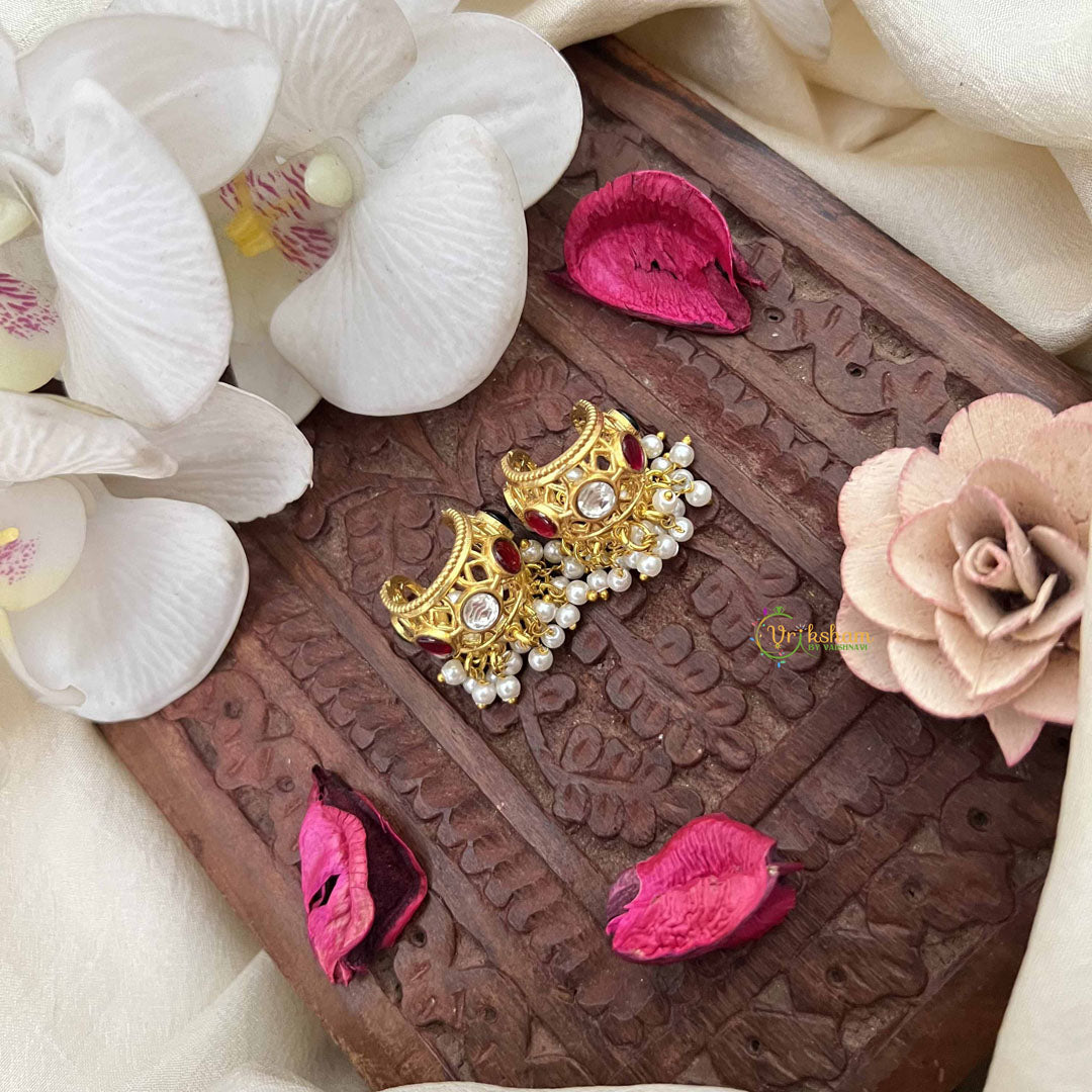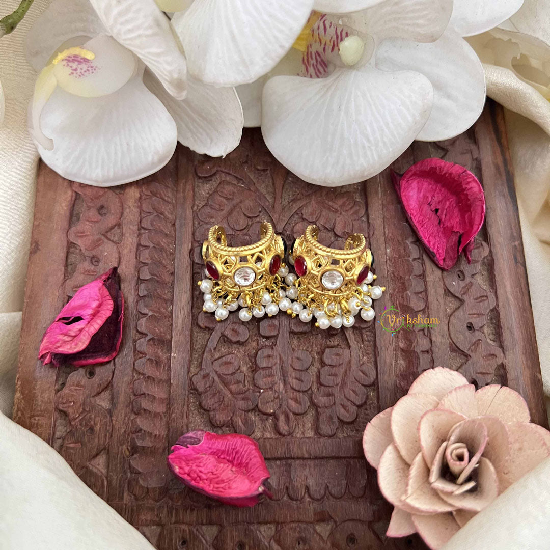 Indulge in timeless elegance with this sophisticated pearl drop bugadi, where classic refinement meets artisanal excellence. This distinguished piece features exquisite kundan jadau craftsmanship, adorned with lustrous pearl drops that cascade gracefully alongside vibrant red, white, and green gemstones. The gold-plated setting creates a luminous canvas that showcases the natural radiance of each pearl and stone. The secure press mechanism ensures comfortable, all-day wearability without compromising on style. Perfect for weddings, celebrations, and formal occasions, this bugadi epitomizes grace and cultural heritage. An heirloom-quality accessory that combines the timeless allure of pearls with traditional Indian jewelry artistry, destined to become a cherished treasure passed through generations.