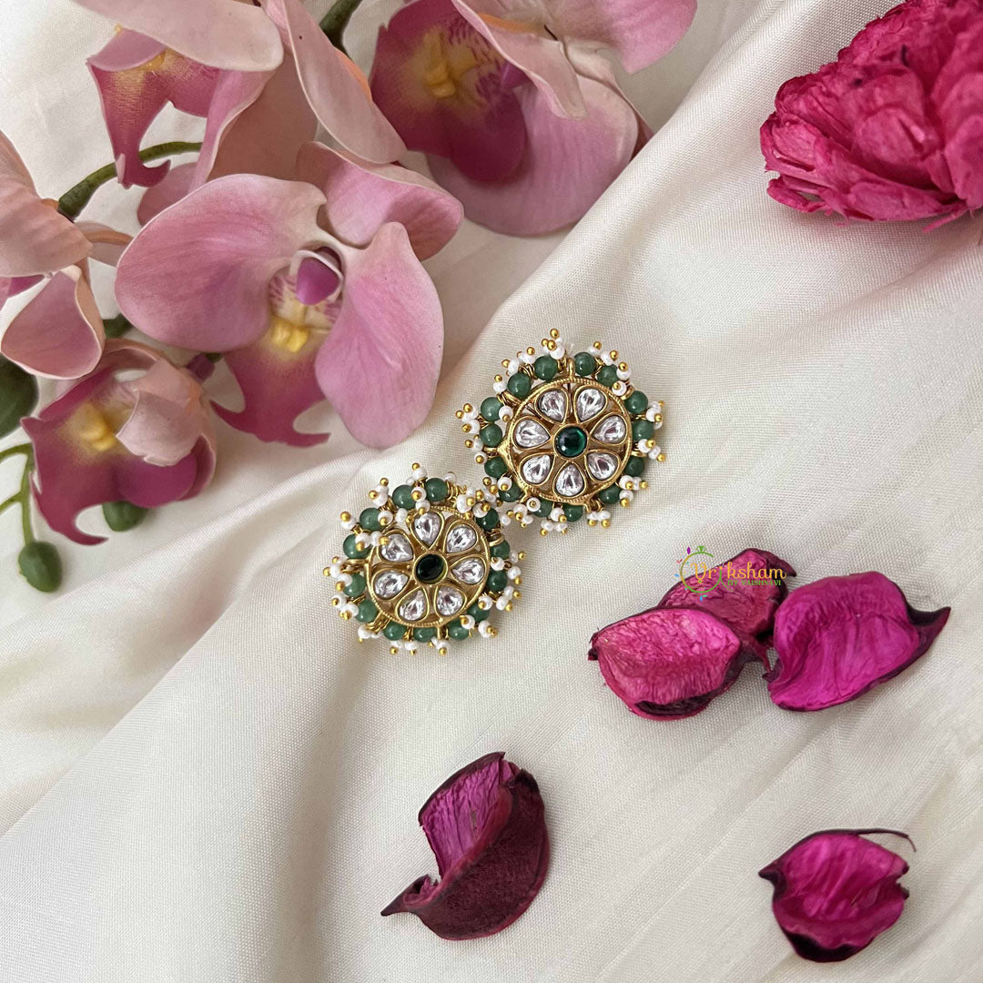 The Vriksham Pearl-Framed Floral Elegance Kundan Jadau & Mint Green Beaded Stud Earrings showcase exquisite kundan craftsmanship enhanced by a delicate pearl frame and soft mint green beads. This elegant floral design offers a refined touch, perfect for adding subtle sophistication to both traditional and contemporary ensembles.