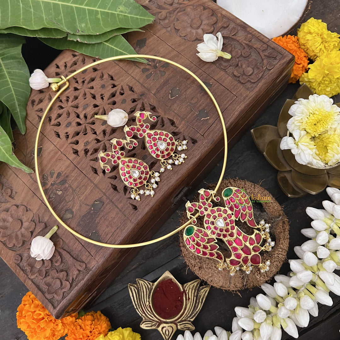 The Vriksham Pendant Dual Peacock Kundan Jadau Hasli Choker features an exquisite red and green design showcasing two intricately crafted peacocks. This sophisticated choker blends traditional artistry with elegant detailing, making it a striking statement piece that adds regal charm and refinement to your ensemble.