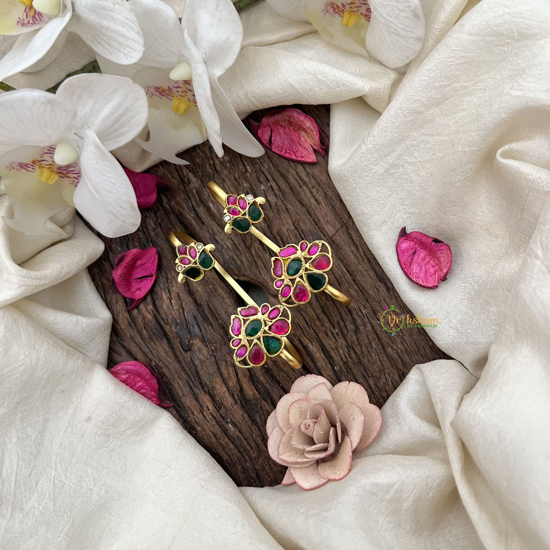 Elevate your elegance with the Vriksham Petal Cluster Jadau Stud & Ear Cuffs Bugadi in striking red, green, and white hues. Designed to complement traditional and contemporary styles, these intricately crafted pieces feature exquisite Jadau work that adds refined charm to any ensemble. Perfect for special occasions, they offer a timeless touch that highlights your sophisticated taste with every wear.