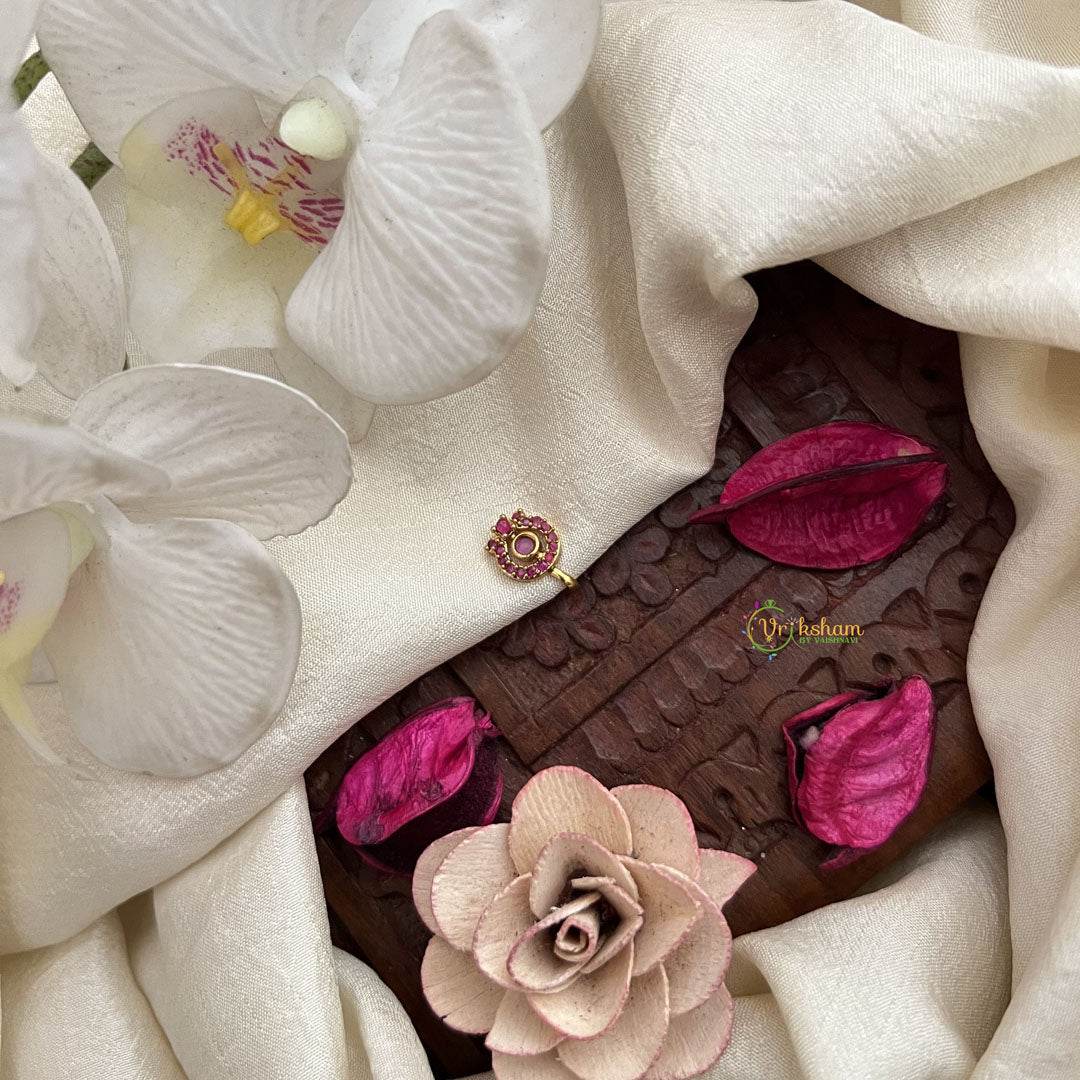 Elevate your elegance with the Vriksham Petite Beauty Nose Pin, featuring a refined blend of red gemstones accented by delicate pearls. This press-on design offers effortless wear while adding a subtle yet striking touch to your look, perfect for those who appreciate understated sophistication.