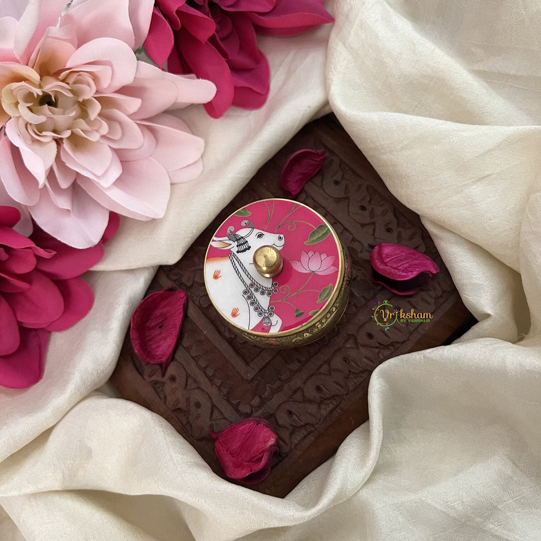 Elevate your traditional rituals with the Vriksham Pichwai Kumkum Box, featuring an exquisite cow print that blends artistry with functionality. Crafted to hold kumkum securely, this elegant dabbi adds a refined touch to your puja setup while preserving the sanctity of your sacred powders. Its sophisticated design makes it a timeless addition to your spiritual collection.