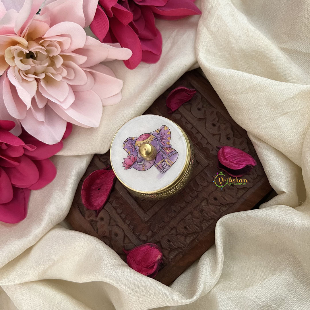 Elevate your traditional rituals with the Vriksham Pichwai Kumkum Box, featuring an exquisite elephant print that blends artistry with functionality. Crafted to hold kumkum securely, this elegant dabbi adds a refined touch to your puja setup while preserving the sanctity of your sacred powders. Its sophisticated design makes it a timeless addition to your spiritual collection.