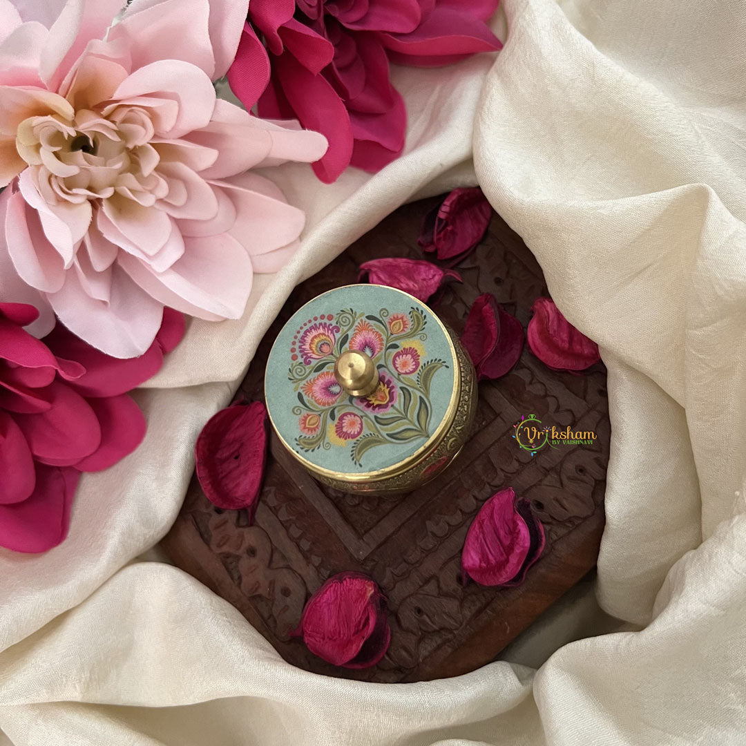 Elevate your traditional rituals with the Vriksham Pichwai Kumkum Box, featuring an exquisite floral print that blends artistry with functionality. Crafted to hold kumkum securely, this elegant dabbi adds a refined touch to your puja setup while preserving the sanctity of your sacred powders. Its sophisticated design makes it a timeless addition to your spiritual collection.