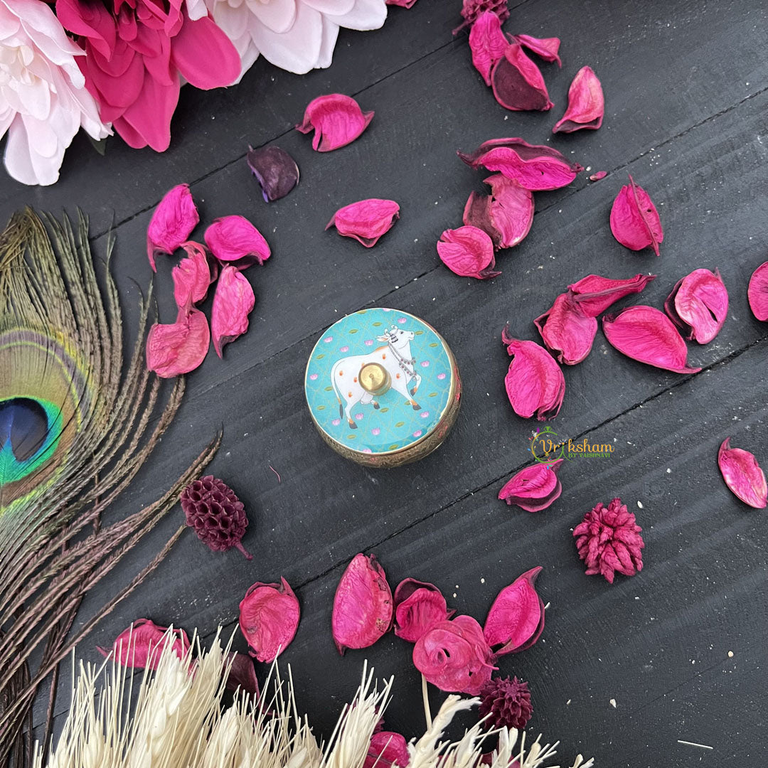 The Vriksham Pichwai Kumkum Box featuring the Kamdhenu print is a perfect blend of tradition and elegance. This finely crafted dabbi securely holds kumkum while showcasing the revered Kamdhenu motif, symbolizing prosperity and purity. Its sophisticated design enriches your sacred rituals, making it a distinguished addition to your puja collection.