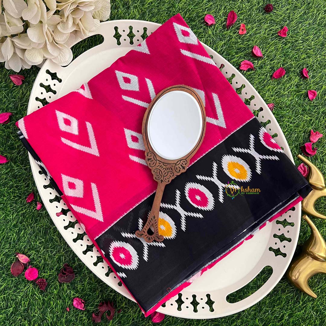 Captivate with this pink geometric ikat print cotton mulmul saree, beautifully framed by a striking black border. Handwoven on traditional looms, this lightweight fabric showcases mesmerizing ikat patterns in soft pink tones, creating visual depth and artistic appeal. The distinctive black border adds dramatic contrast and contemporary edge to this classic weave. The breathable mulmul fabric ensures exceptional comfort and fluid draping, making it perfect for warm climates and all-day wear. Ideal for those seeking modern sophistication with traditional craftsmanship, this saree transitions beautifully from casual gatherings to festive occasions. Features an attached blouse for convenient styling. Spanning 6.3 meters with an 0.8-meter blouse and weighing 500-750 gm, this handcrafted treasure showcases authentic artisanal excellence. Dry wash only to maintain the fabric's ikat pattern clarity and border definition.