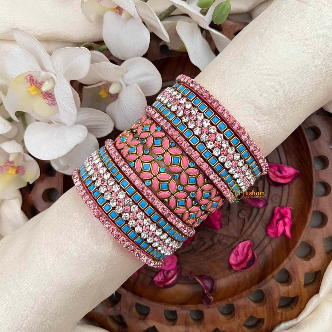 Elevate your traditional ensemble with this exquisite bangle set, featuring twelve pieces adorned with intricate kundan work. The harmonious blend of pink and sky blue silk threads creates a refined aesthetic, perfect for weddings, festivals, and special occasions. Each bangle showcases meticulous craftsmanship with authentic kundan embellishments that catch light beautifully. The silk thread construction ensures comfort for extended wear while maintaining its elegant appearance. A versatile collection that seamlessly complements both contemporary and traditional attire, this set is an essential addition to any jewelry wardrobe.