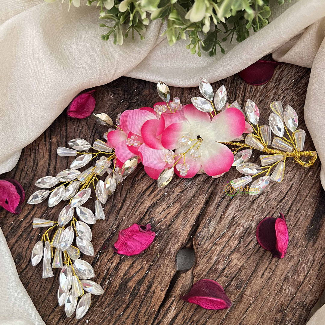 The Vriksham Pink With Crystal Style Floral Gajra features delicate pink blossoms enhanced with sparkling crystal accents. This sophisticated accessory adds a refined and elegant touch to traditional hairstyles, perfect for weddings and special occasions.