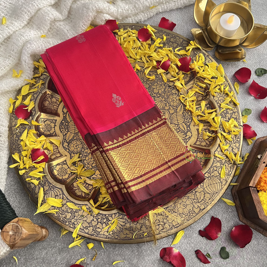 Thiribhuvanam Silk Saree – Comes with SILK MARK - Festive wear saree – Butta work throughout the saree; Traditional contrast border and pallu.