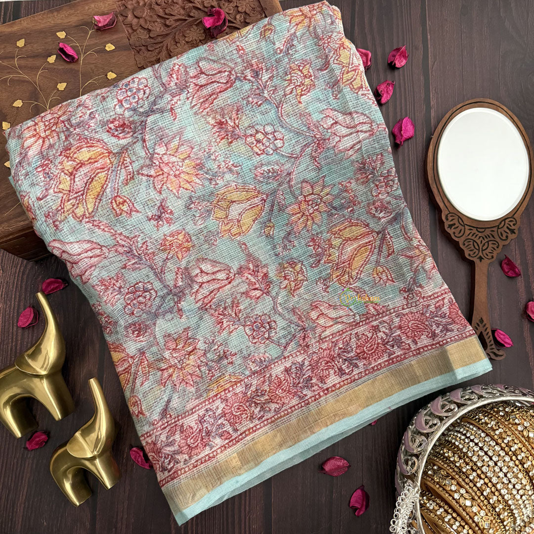 Experience elegance and luxury with our Vriksham Pista Green Floral Print Kotta Cotton Saree. Made from the finest quality of Kotta Cotton, this saree features a beautiful floral print design that exudes sophistication and style. Elevate your wardrobe with this exclusive piece and make a statement wherever you go.