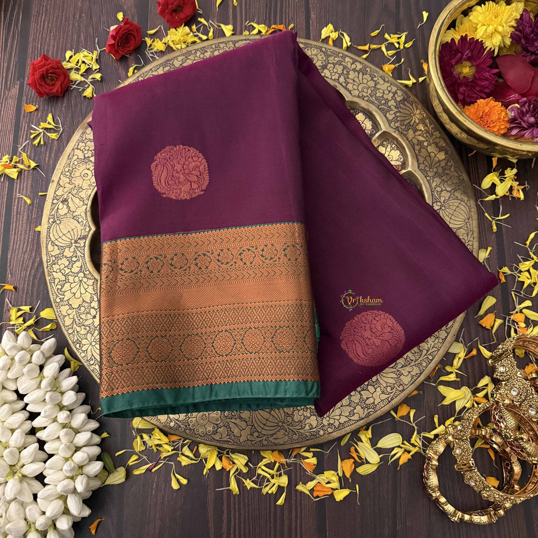 The Vriksham Plum Maroon Kanchi Silk Saree combines a rich plum maroon base with exquisite copper zari detailing and a subtle green selvedge. Crafted from premium silk, this saree offers a luxurious sheen and elegant drape, making it perfect for sophisticated occasions that celebrate timeless tradition and refined style.