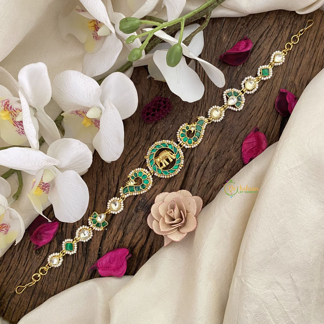 Indulge in luxury with the Vriksham Precious Elephant Kundan Jadau Sheeshphool-White Green sheeshphool. Crafted with exquisite precision, this piece features a majestic elephant design adorned with Kundan Jadau and Sheeshphool-White stones. Enhance any outfit with this elegant and exclusive accessory.