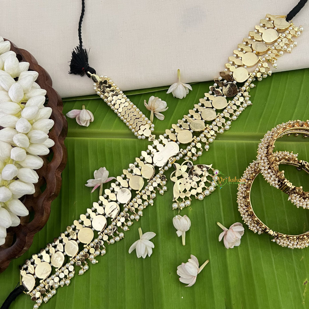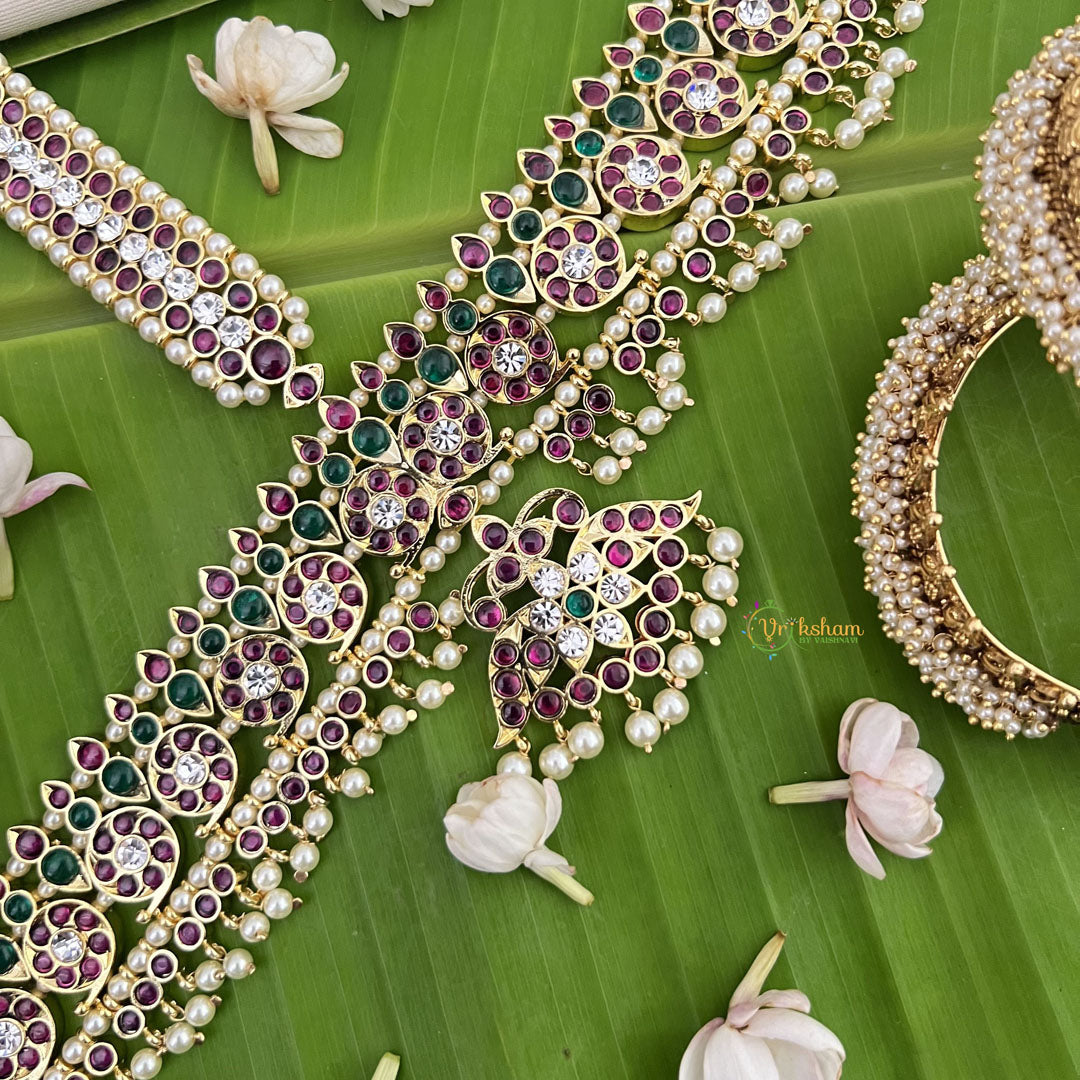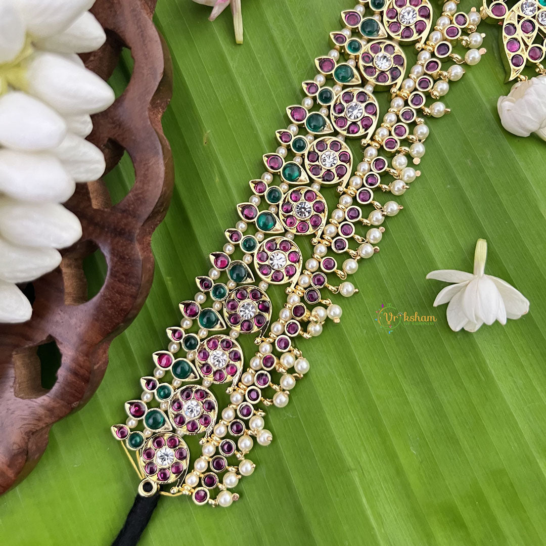 The Vriksham Precious Gold Polish Kemp Mang Tikka in Red, Green, and White with pearl accents embodies refined elegance and intricate artistry. This sophisticated piece enhances traditional attire with its vibrant colors and delicate pearls, making it a perfect accessory for special occasions and graceful celebrations.