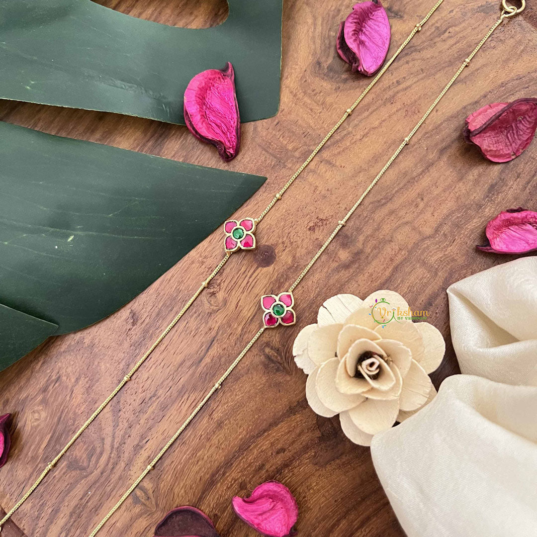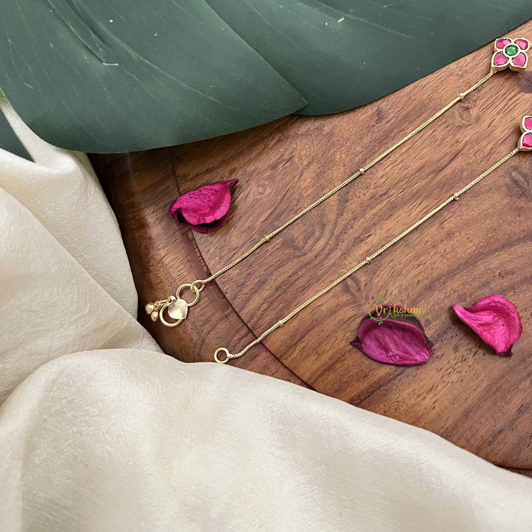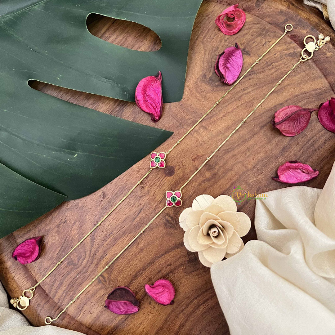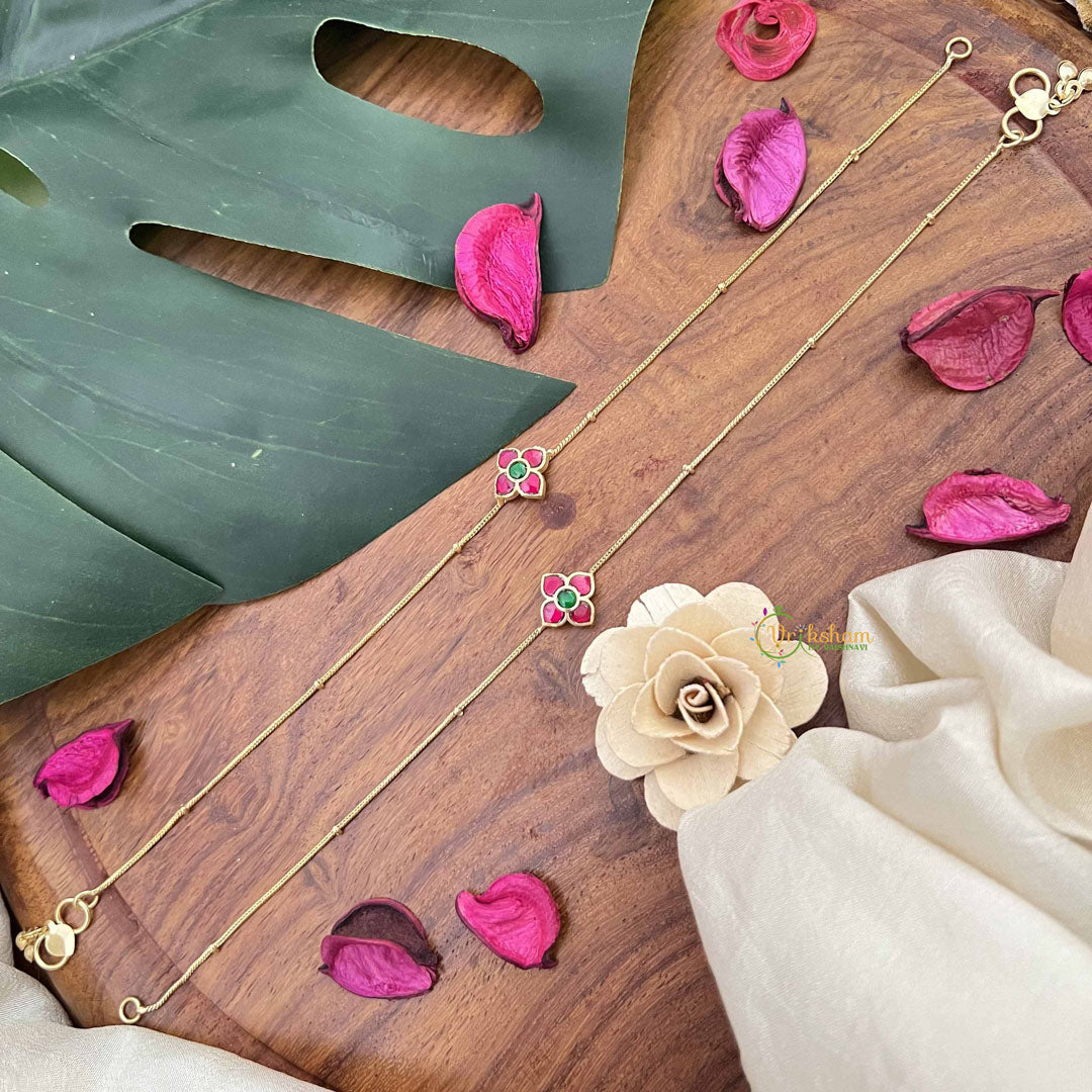 Celebrate botanical artistry with these Precious Jadau Kundan Anklets, showcasing an intricate floral design adorned with vibrant red and green stones. Executed through the revered Jadau Kundan technique, each stone is meticulously positioned in gold foil, creating a luminous, multi-dimensional aesthetic that captures light beautifully. The floral motif honors nature's elegance while the complementary red and green palette adds visual richness and depth. Ideal for weddings, festivals, and cherished celebrations, these anklets embody centuries of traditional craftsmanship and artistic excellence. A distinguished investment piece for those who appreciate heritage jewelry, botanical inspiration, and timeless beauty that celebrates cultural artistry and refined taste.