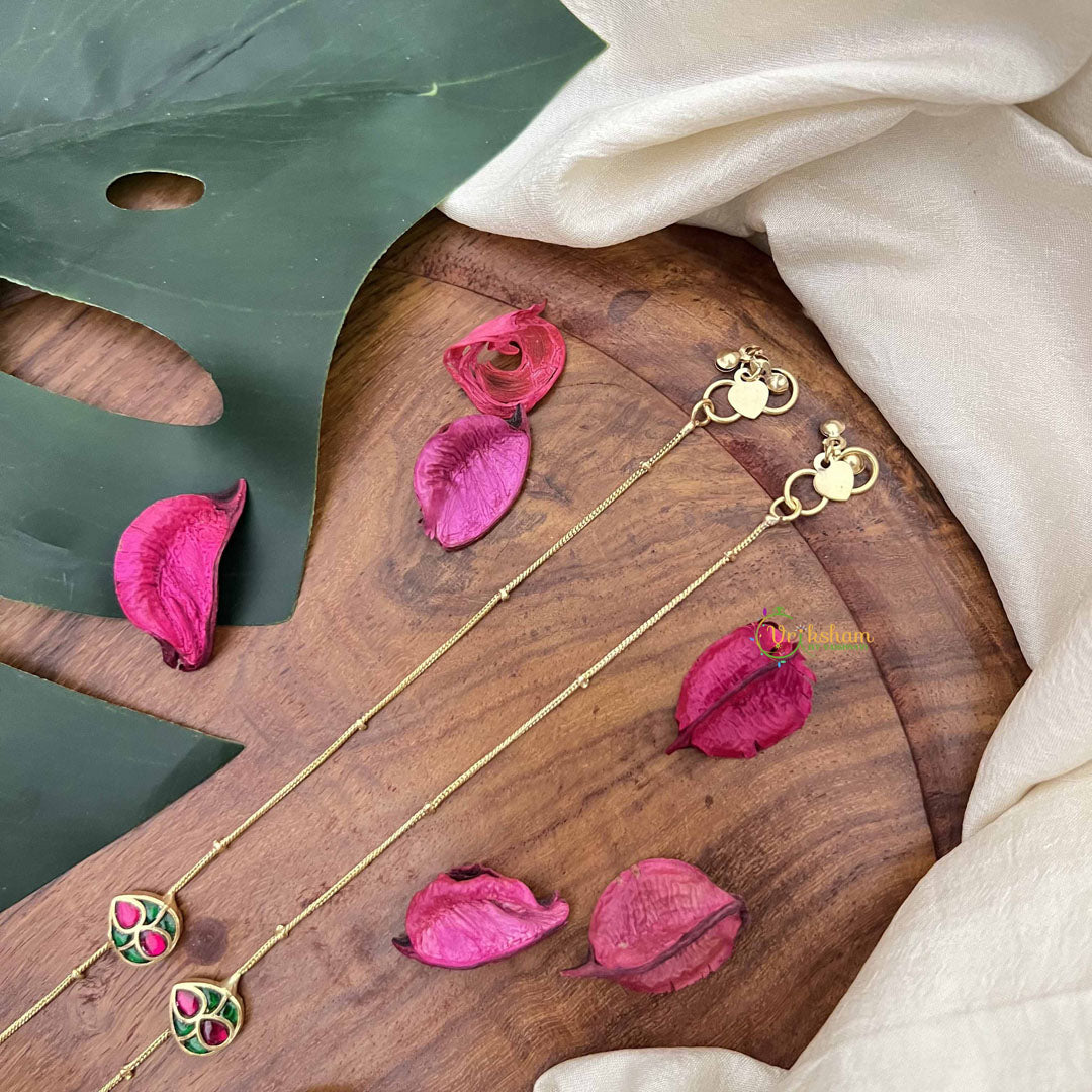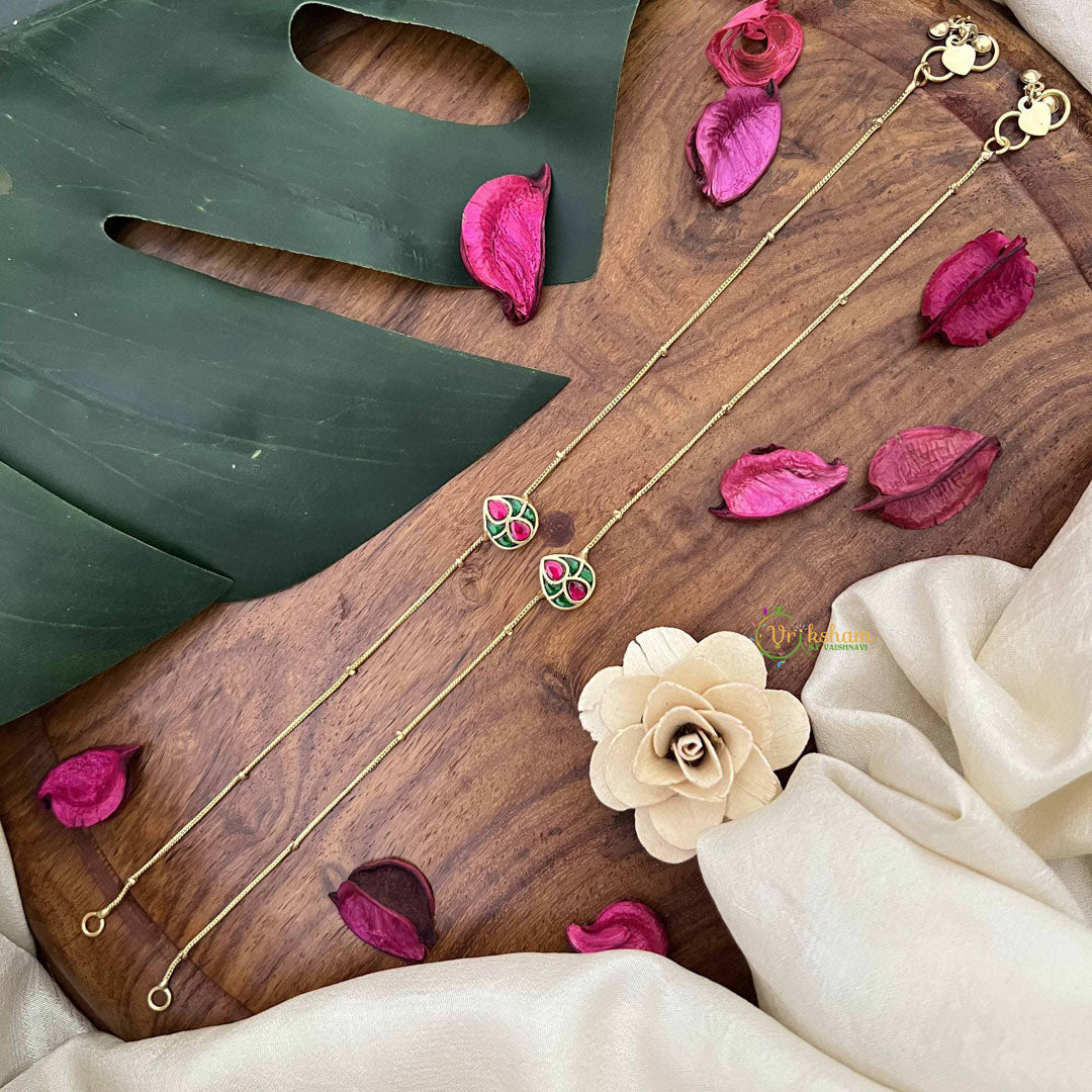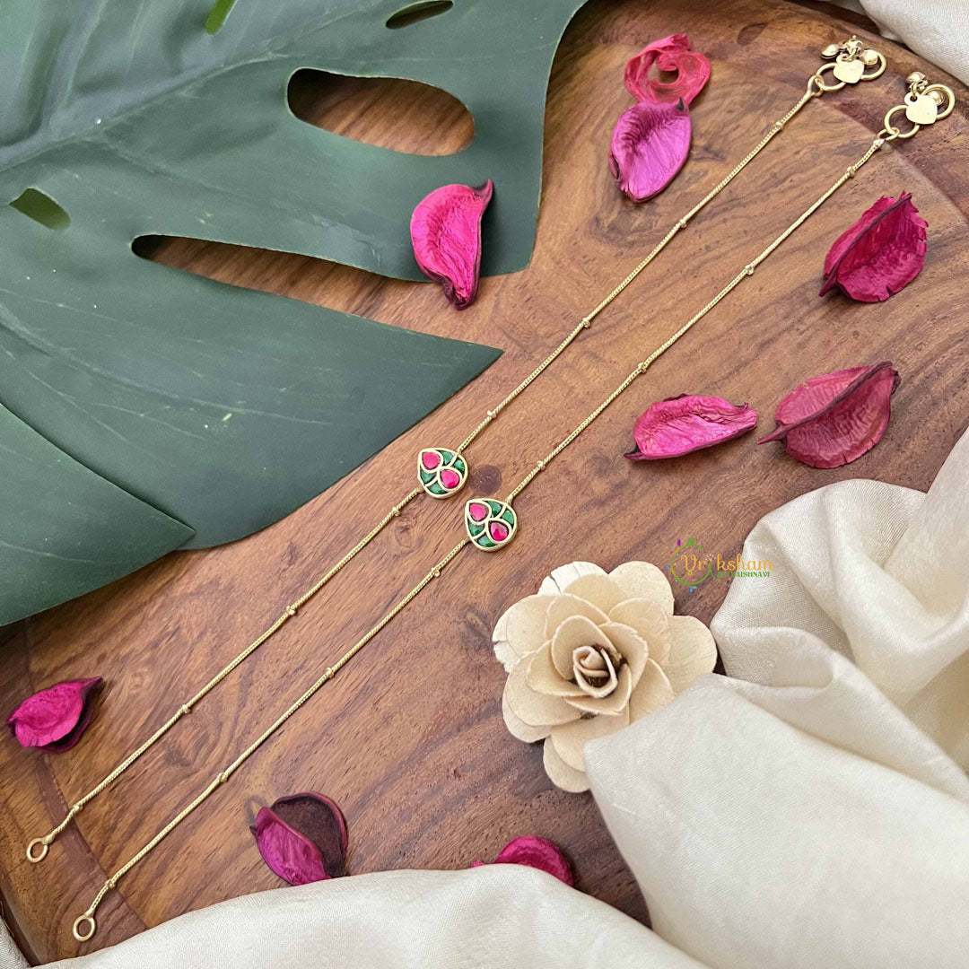 Discover the splendor of these Precious Jadau Kundan Pendant Anklets, featuring an enchanting blend of pink and green stones with traditional tilak detailing. Executed using the revered Jadau Kundan technique, each anklet showcases stones meticulously set in gold foil, creating a luminous, multi-faceted design. The tilak element adds cultural significance and spiritual resonance, while the complementary pink and green palette creates visual harmony. Ideal for weddings, festivals, and momentous celebrations, these anklets represent the pinnacle of traditional Indian jewelry craftsmanship. A distinguished heirloom piece for those who honor heritage and seek jewelry that embodies centuries of artistry and enduring elegance.