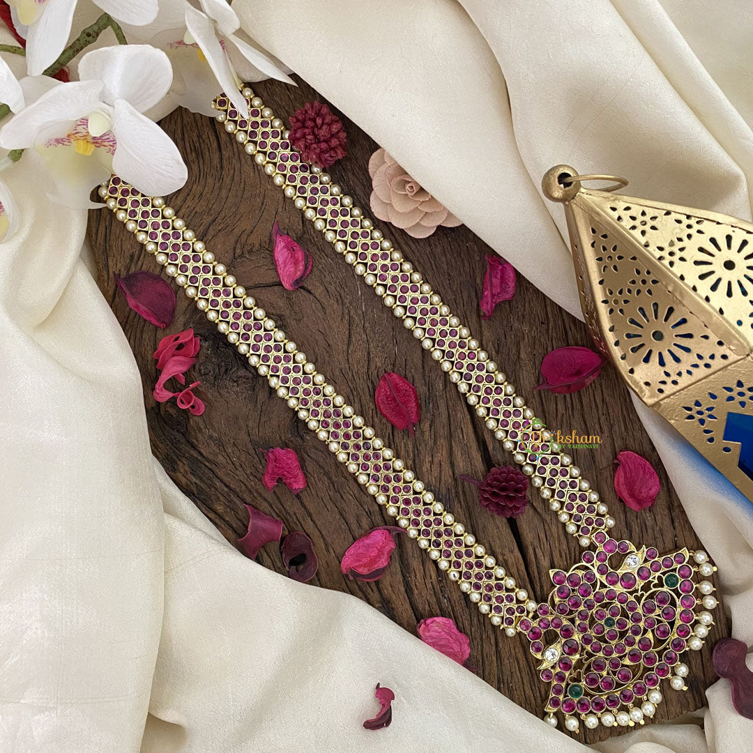 Embody elegance and opulence with the Vriksham Precious Kemp Dual Peacock Pendant Haram. This exquisite and intricate necklace features dual peacock pendants adorned with precious kemp stones, adding a touch of luxury to any ensemble. Experience the beauty and sophistication of this statement piece.