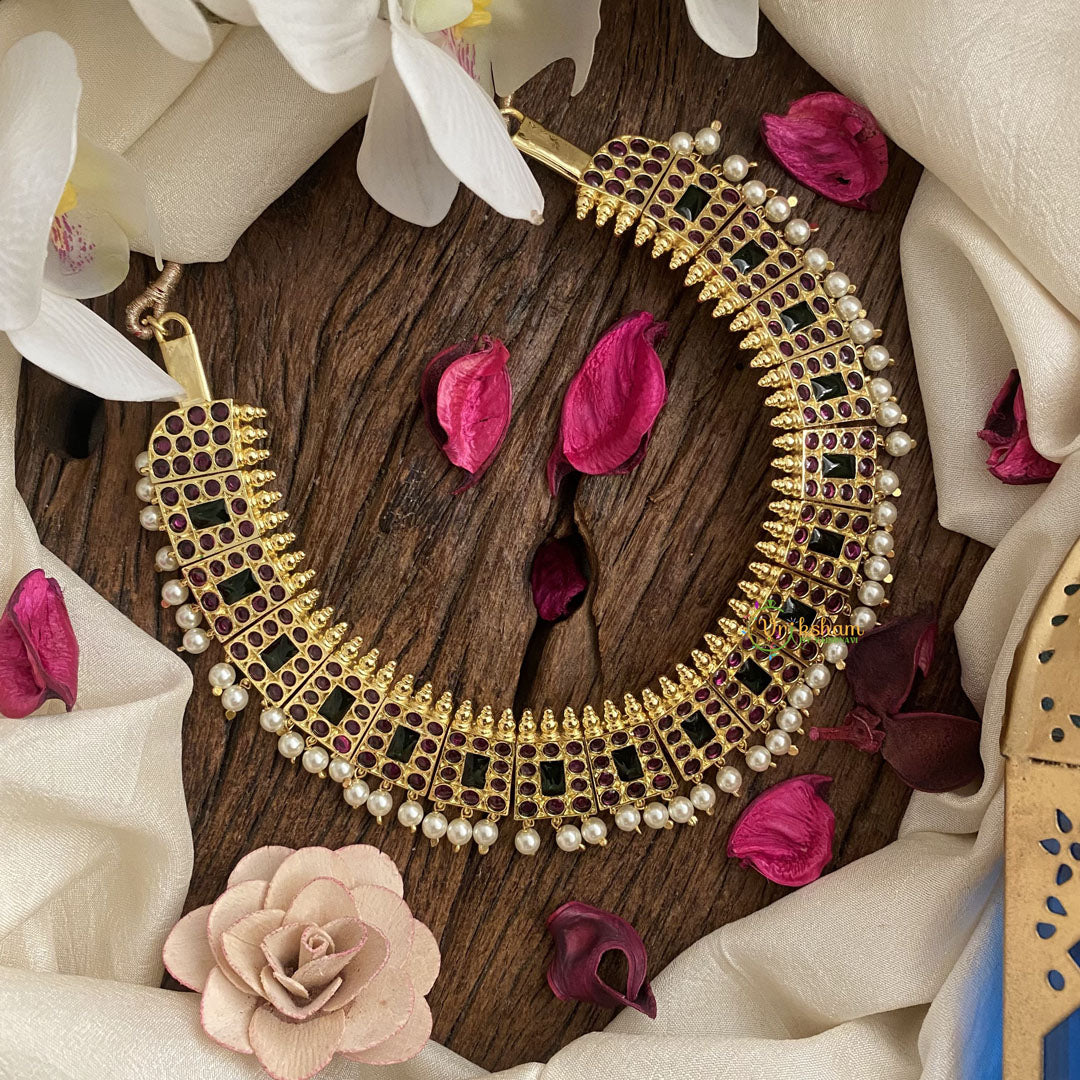 Indulge in the exquisite elegance of our Vriksham Precious Kemp High Neck Choker. Adorned with lustrous pearls and a striking green hue, this luxurious piece radiates sophistication and exclusivity. Elevate any outfit with its intricate design and impeccable craftsmanship. Perfect for those seeking a touch of opulence.