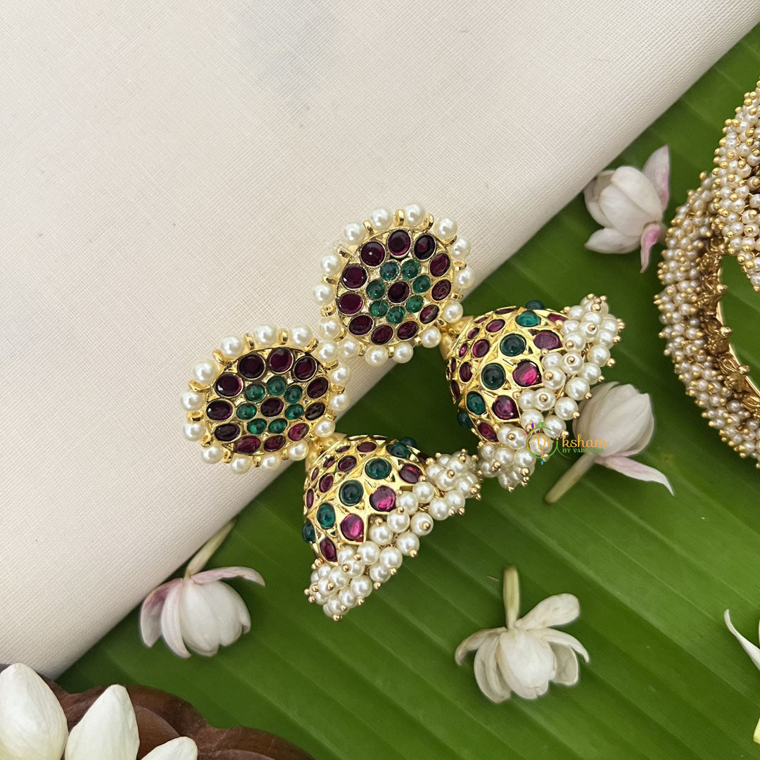 Elevate your traditional ensemble with the Vriksham Precious Kemp Jhumka in a large, striking design. Featuring a harmonious blend of green and red hues accented by lustrous pearls, this exquisite piece embodies timeless elegance and craftsmanship. Perfect for special occasions, it adds a refined touch of cultural heritage to your look.
