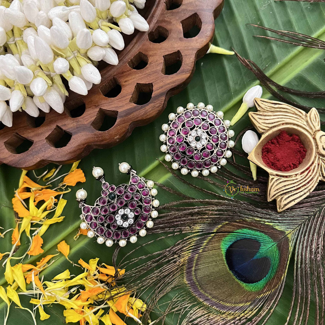 The Vriksham Precious Kemp Pearl Coted Chandran & Suryan combines traditional artistry with a refined palette of red, green, and white. Adorned with lustrous pearls, this sophisticated piece beautifully represents the celestial motifs of Chandran and Suryan, adding a graceful and timeless elegance to your ensemble for any distinguished occasion.
