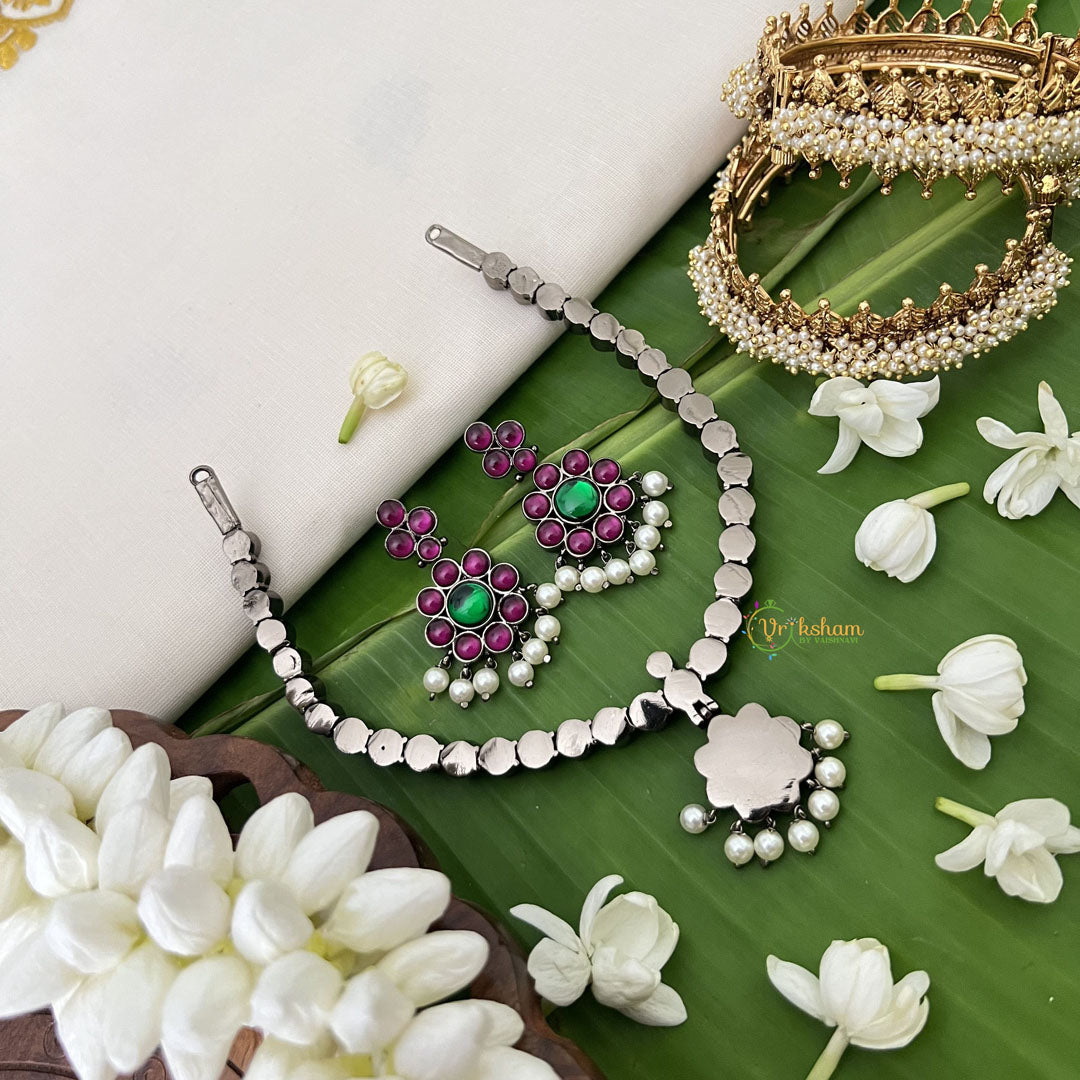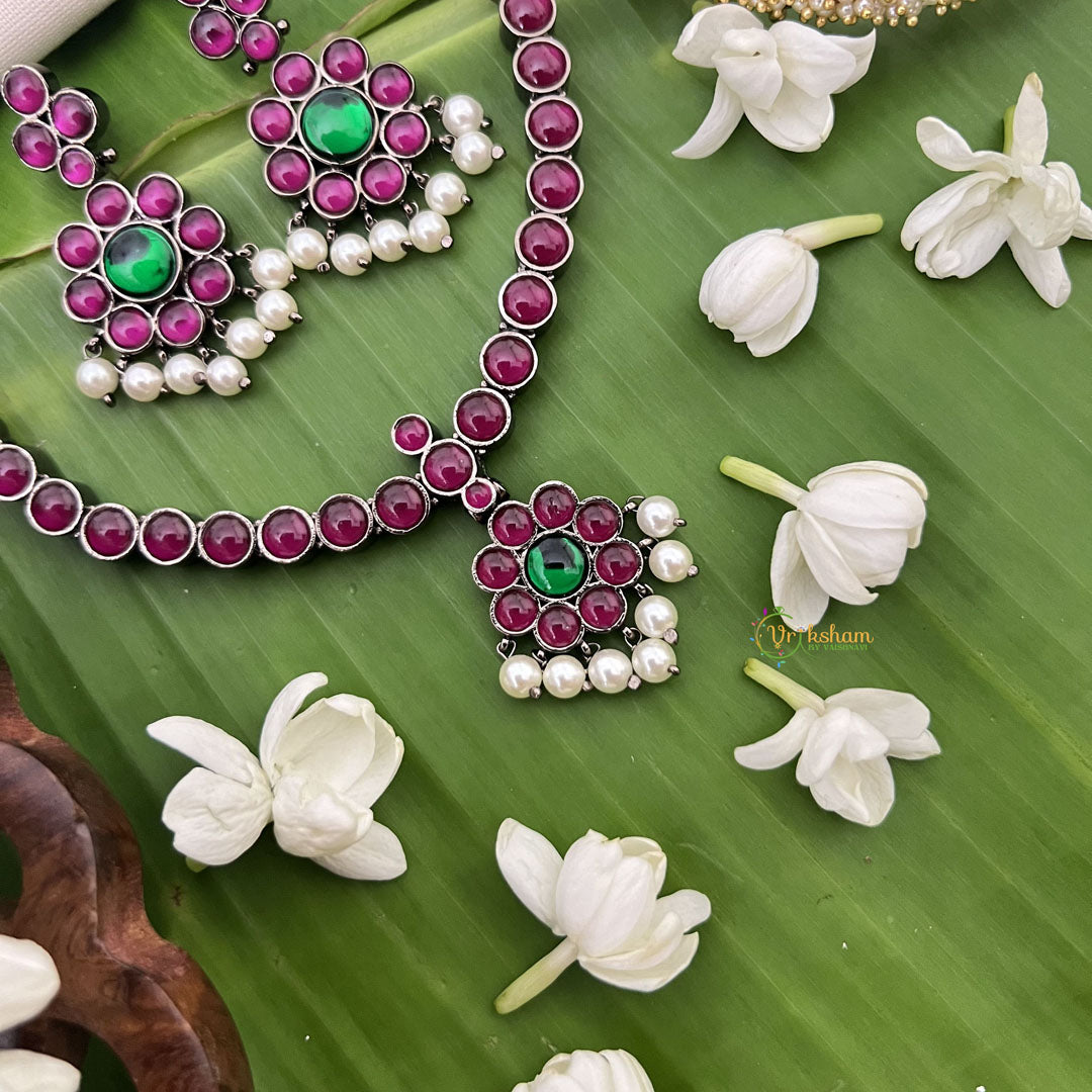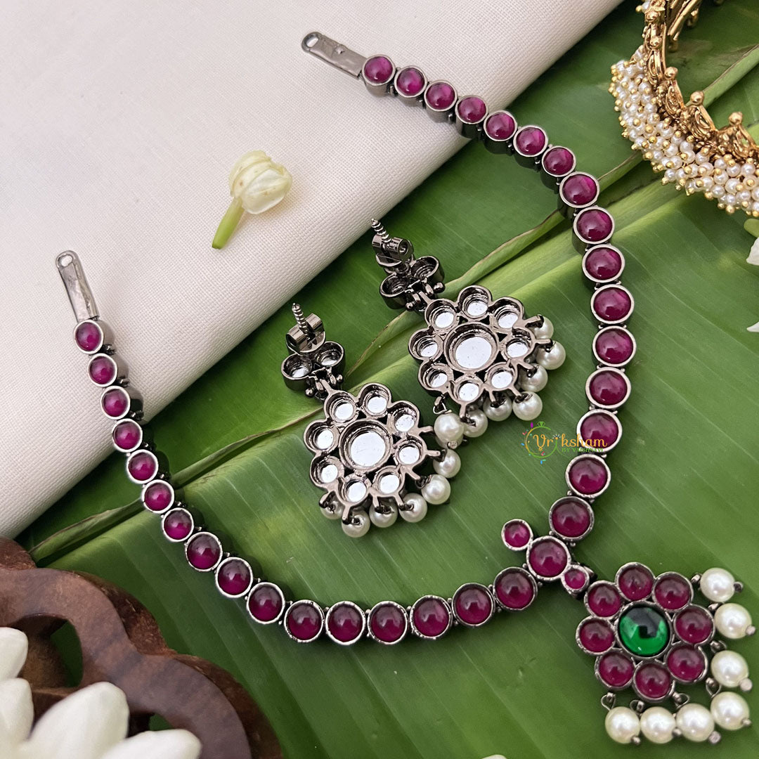 Elevate your elegance with the Vriksham Precious Kemp Pendant Short Neckpiece in Red Pearl. This exquisite piece features a finely crafted Kemp pendant adorned with rich red pearls, perfect for adding a touch of timeless sophistication to any outfit. Its short length ensures it sits gracefully around the neck, making it ideal for both traditional and contemporary styles. A refined accessory that enhances your presence with subtle charm and classic beauty.