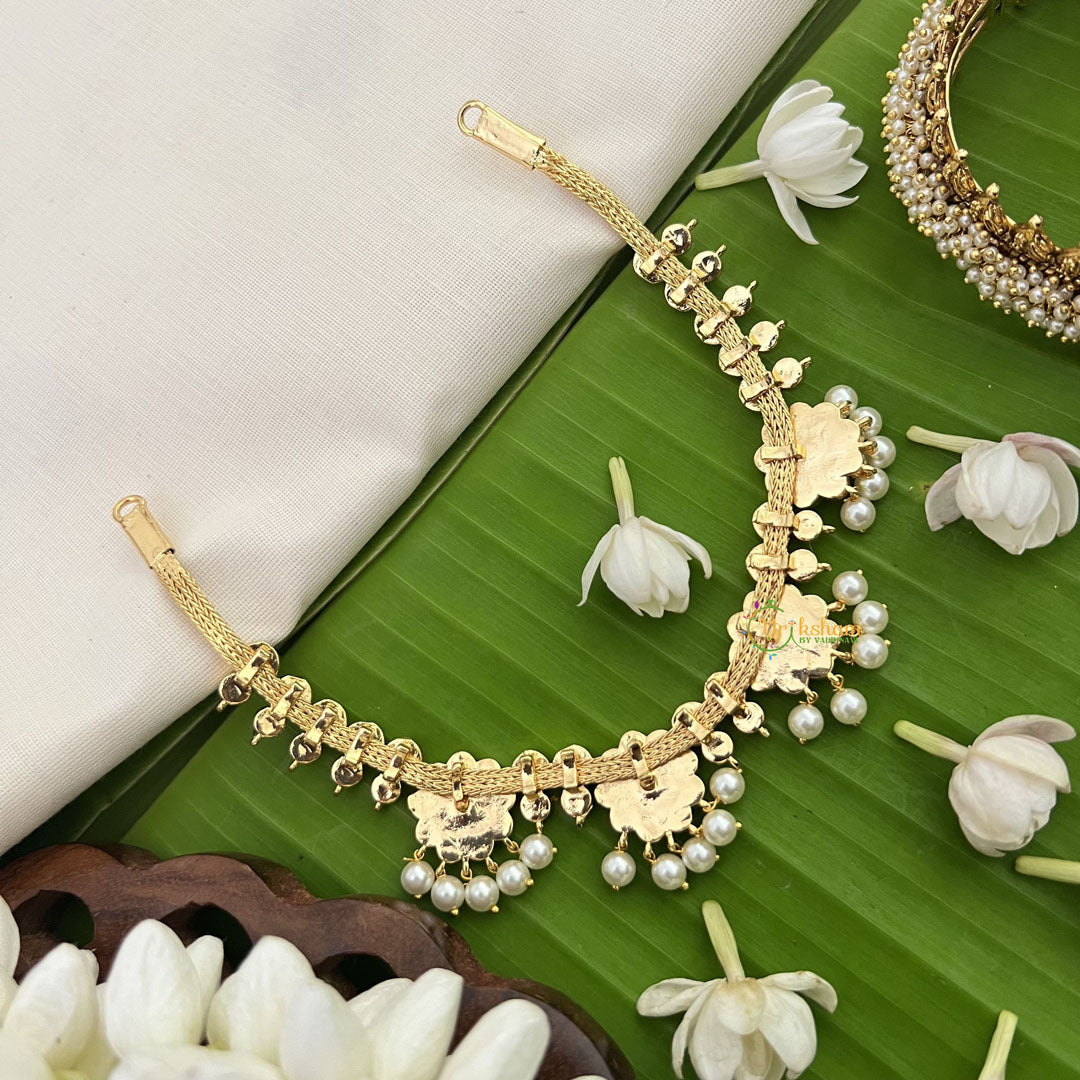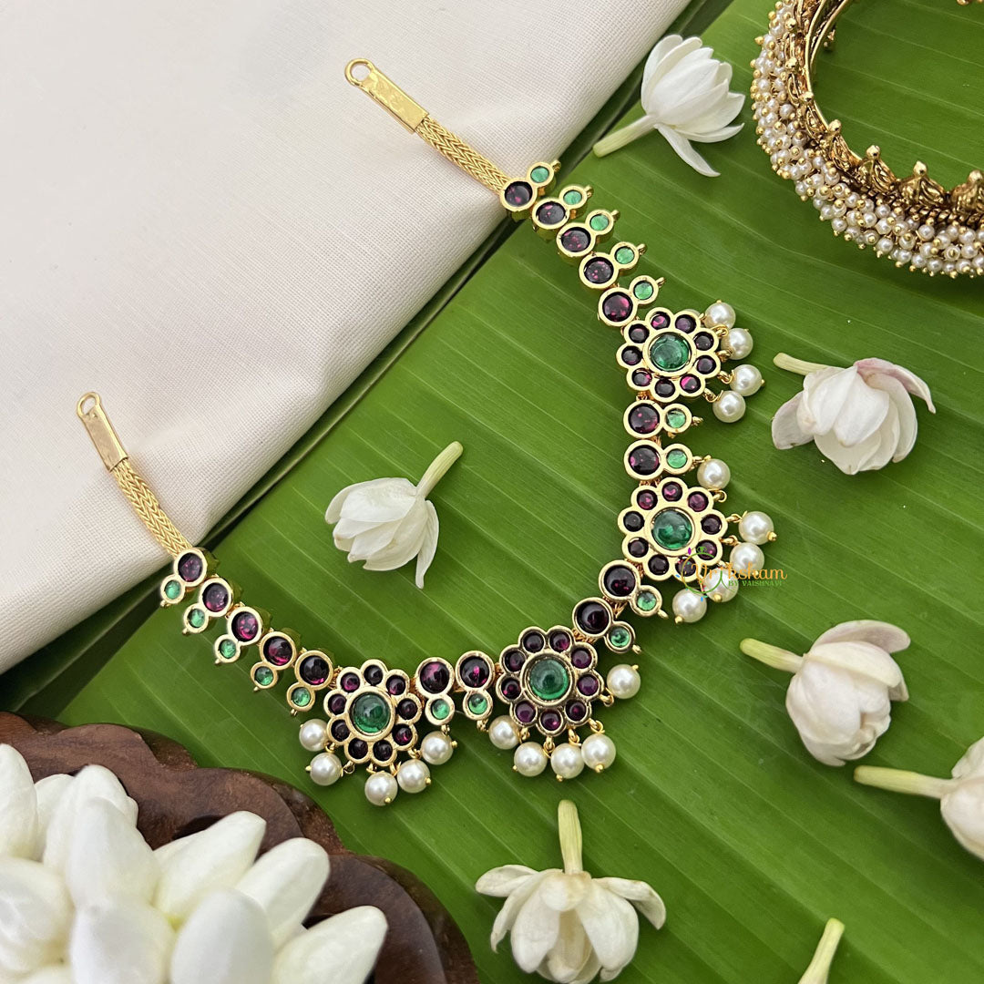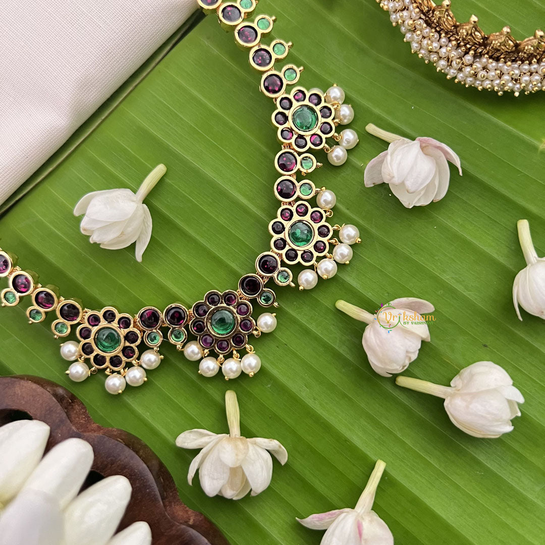 The Vriksham Precious Kemp Stone Pendant Short Neckpiece in Red and Green, accented with pearls, exemplifies elegant craftsmanship and vibrant design. This sophisticated piece features a striking pendant that adds a refined touch to traditional attire, making it an ideal choice for enhancing your look on special occasions.