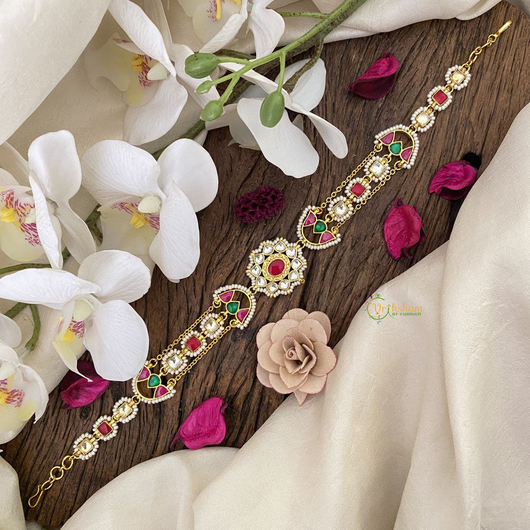 Indulge in luxury with Vriksham's Precious Kundan Jadau Sheeshphool in a stunning combination of red, green, and white. This intricate and exclusive design will elevate any outfit with its elegance and craftsmanship. Adorn yourself with the beauty of these precious jewels.