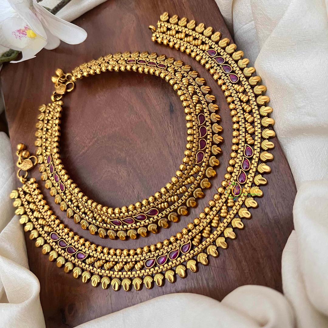 Elevate your bridal ensemble with this premium anklet, featuring four stunning red pear accents set in lustrous gold. The rich crimson stones add vibrant elegance to the refined gold setting, creating a striking contrast that captures attention and admiration. Each pear-shaped stone is thoughtfully positioned to enhance the overall design while maintaining balanced sophistication. Perfect for brides seeking jewelry that combines precious beauty with traditional bridal aesthetics, this anklet serves as a focal point that celebrates color and craftsmanship. An exquisite choice for those who appreciate premium quality and the timeless allure of gemstone-adorned bridal jewelry.