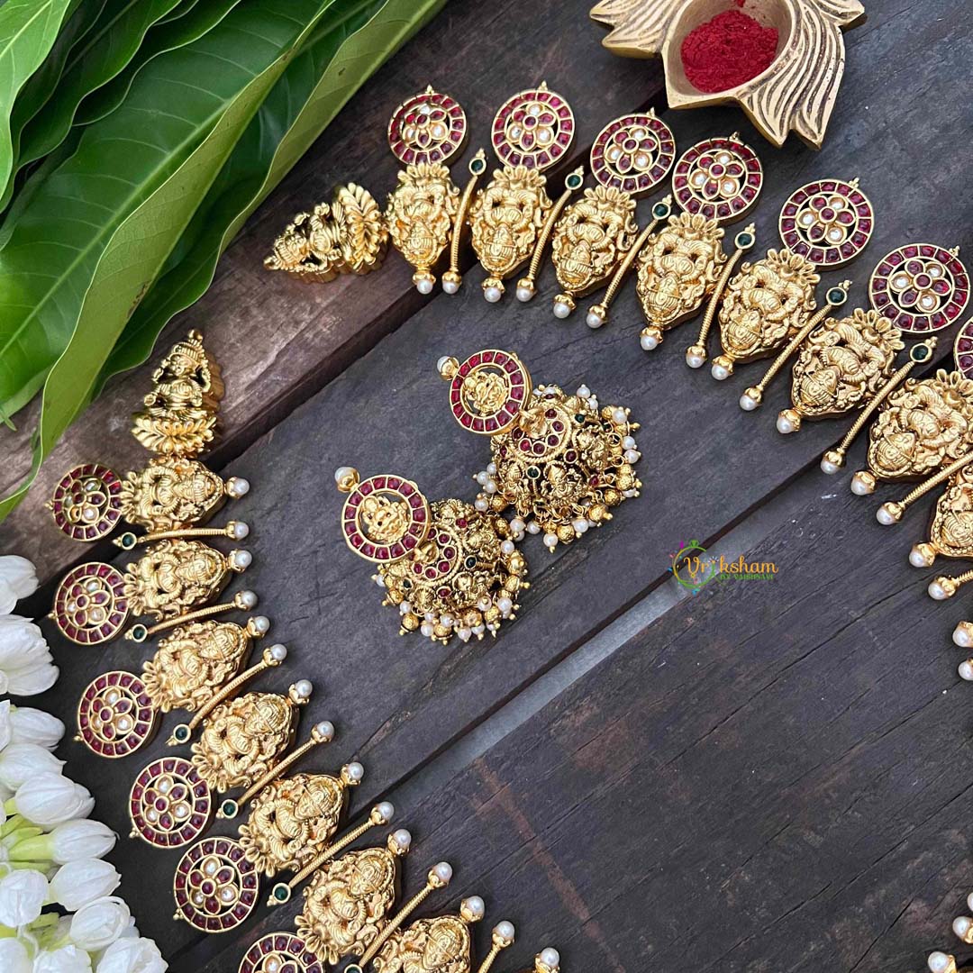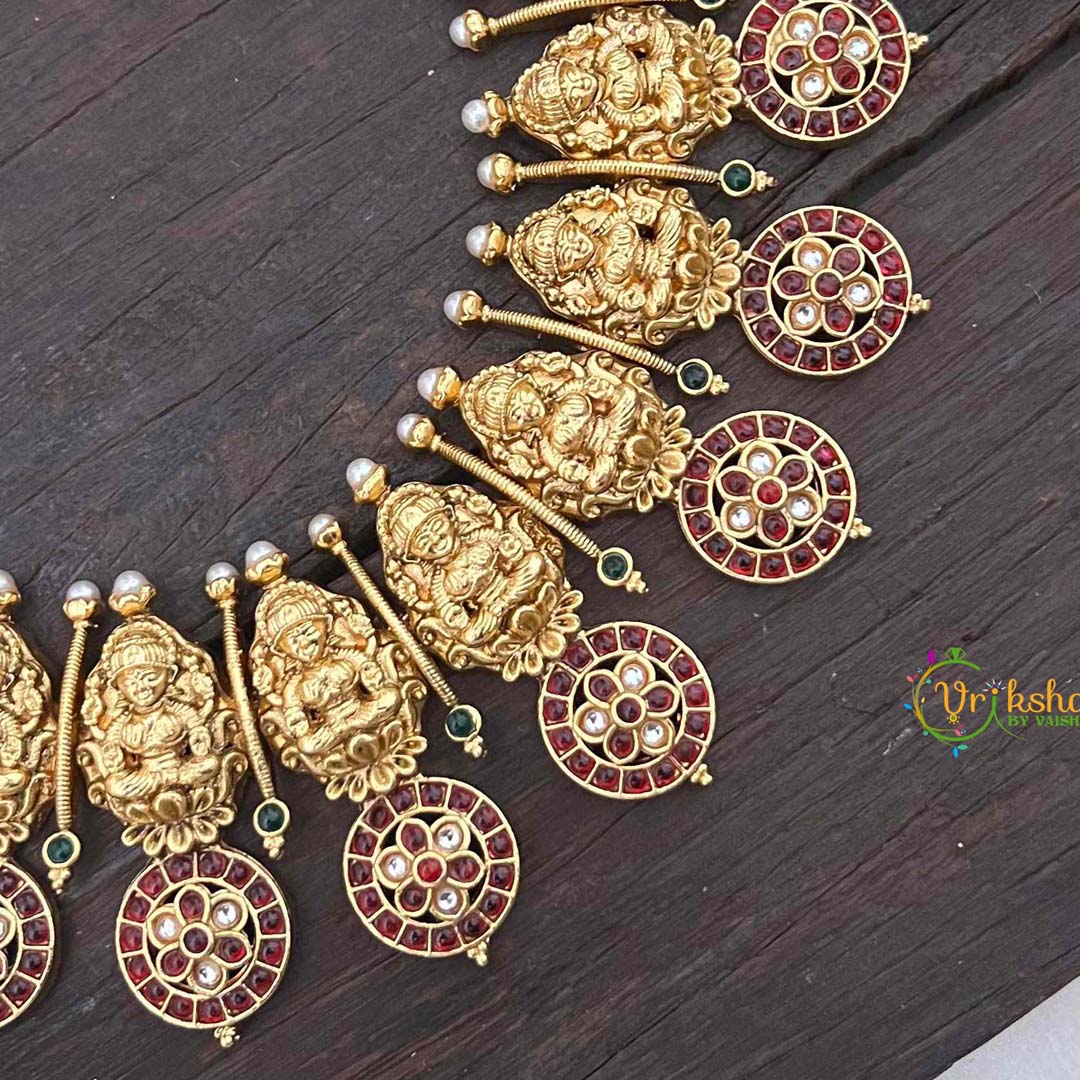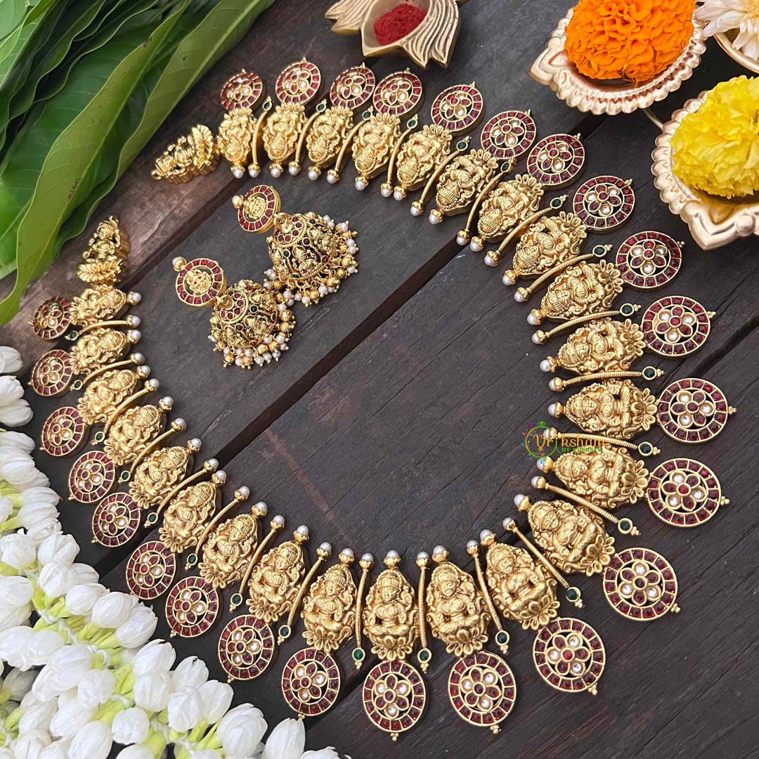Premium AD Stone Lakshmi Kaasumalai Haram -LAYERED Neckpiece -Red Green Ad stone Coin style long neckpiece; with two mogappu; comes with matching ear jhumkas.